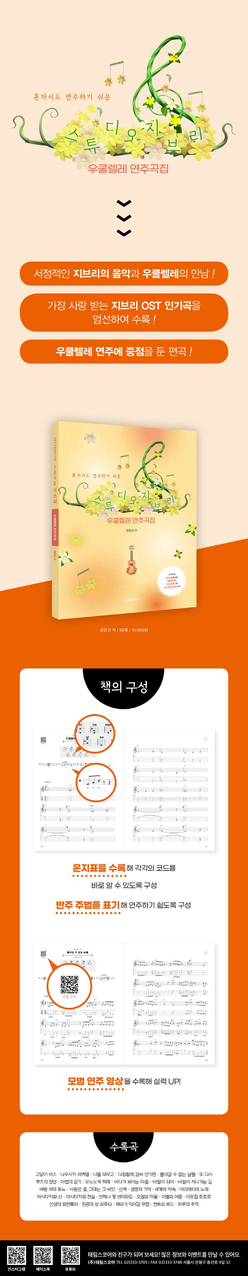 스튜디오 지브리 음악의 감성을 살리고 쉬운 코드 진행으로 편곡하였습니다. 바레코드를 최소한으로 줄였으며, 제목 아래에 코드표를 첨부하여 각각의 코드를 바로 알 수 있도록 하였습니다. 우쿨렐레는 네 줄밖에 없는 악기이지만 멜로디 연주와 코드 연주가 가능하며, 독주 또는 앙상블의 시너지가 가득한 악기입니다. 앙상블의 효과를 낼 때 스트로크를 적용할 수 있도록 만들었습니다. 이 책을 통해 지브리 음악을 우쿨렐레로 쉽게 연주할 수 있기를 바랍니다.