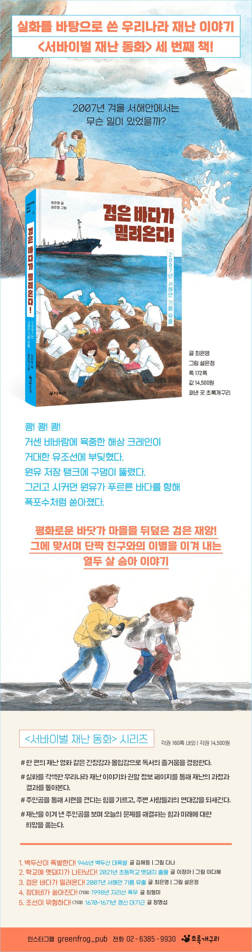 그렇다면 한국인들이 기억하는 최악의 원유 유출 사고는 무엇일까? 아마도 국내에서 일어난 삼성-허베이스피릿호 원유 유출 사고일 것이다. 〈서바이벌 재난 동화〉 시리즈는 세 번째 이야기로 2007년 12월, 한순간에 푸른빛 서해를 죽음의 바다로 만든 원유 유출 사고를 각색하여 동화로 선보인다.