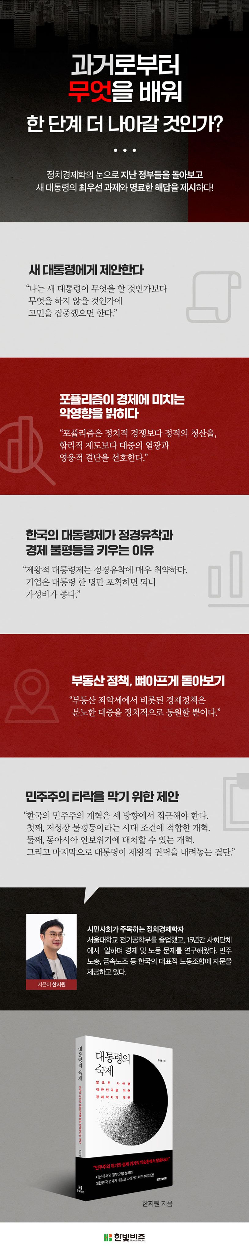 새 정부가 출범할 때마다 우리는 많은 기대와 불안을 품는다. 대중이 원하는 사람이 대통령이 되면 사회가 더 나아질 거라 기대하지만, 80% 가까이 전폭적 지지를 받은 대통령이 지난 정부를 이끌었음에도 한국사회 갈등은 더 심해졌고, 민주주의 지수나 경제지표도 나아지지 못했다. 우리가 뽑은 대통령이 충분히 훌륭하지 못해서였을까? 새로운 대통령이 제대로만 한다면 한국사회는 더 나아질 수 있을까?