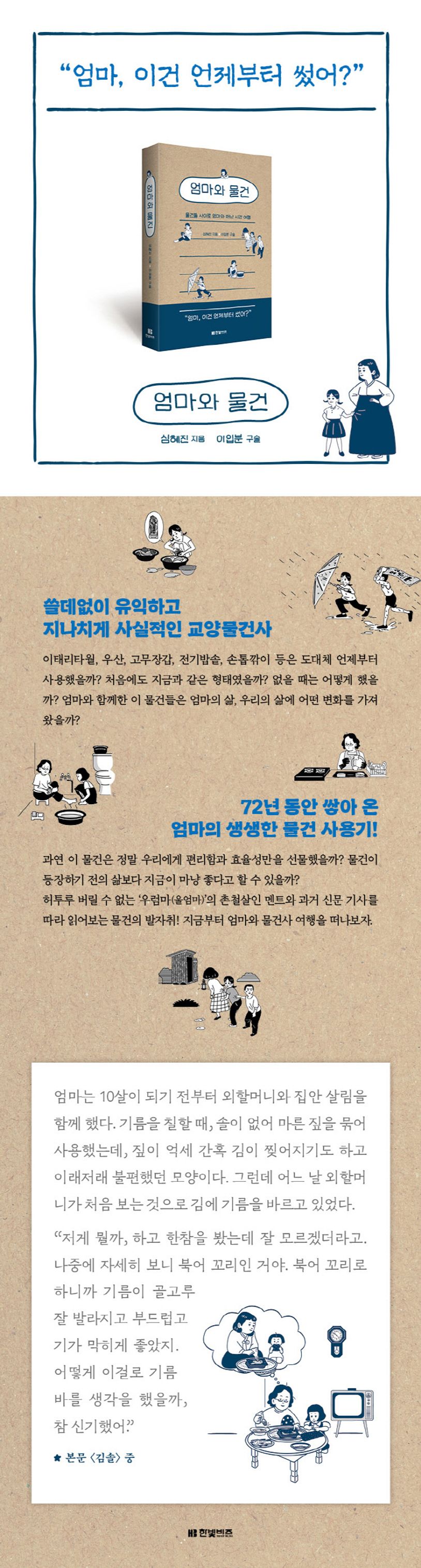 저자의 엄마는 1950년에 태어났다. 그때부터 지금까지 장장 72년 간 그녀가 사용했던 물건만 늘어놓아도 대한민국의 역사가 그려질 판이다. 그 중에서 21가지 물건을 골랐다. 엄마랑 가까이 붙어 있던 놈들로, 엄마의 재미있는 경험들이 담겨 있는 놈들로 말이다.