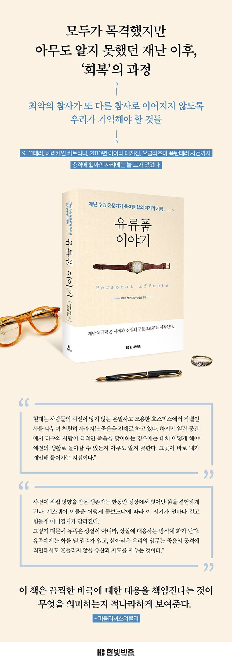 전 세계 곳곳에서 자연재해를 비롯해 비참한 대규모 사건과 사고가 발생했다. 그리고 제대로 규명되고 처리되지 못한 참사는 집단적 트라우마를 남겼다. 무엇보다 코로나19와 최근의 인재들로 인해 안전에 관한 사회의 관심이 매우 커진 지금이다. 우리나라에서 허리케인이나 쓰나미와 같은 자연재해는 상대적으로 드물다. 그러나 몇 번의 참사는 있었다. 참사와 재난은 뜻밖에 일어나며 비참하고 끔찍하다는 점에서 같다. 이 책 ≪유류품 이야기≫는 아픔을 덮고 살아가는 우리에게 필요한 책이다.