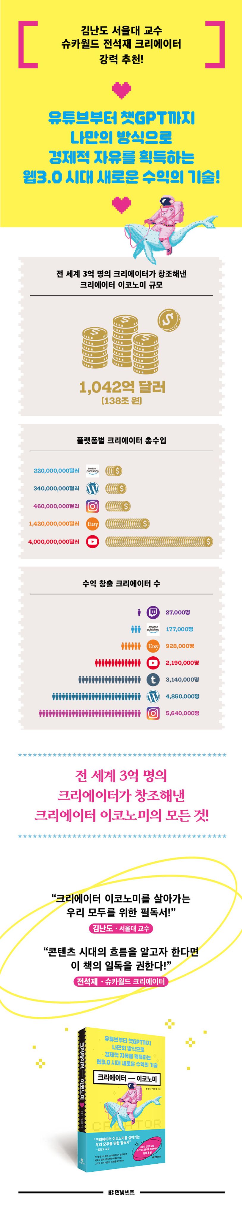 크리에이터 이코노미를 10여 년간 이끌어 온 현장의 경험과 치밀한 산업 분석이 어우러진 《크리에이터 이코노미》는 새로운 기술과 트렌드를 포착해 성장의 도구로 사용할 수 있는 사람이 성공하는 크리에이터 이코노미의 시대를 톺아보고, 새로운 부의 기술을 제안한다.