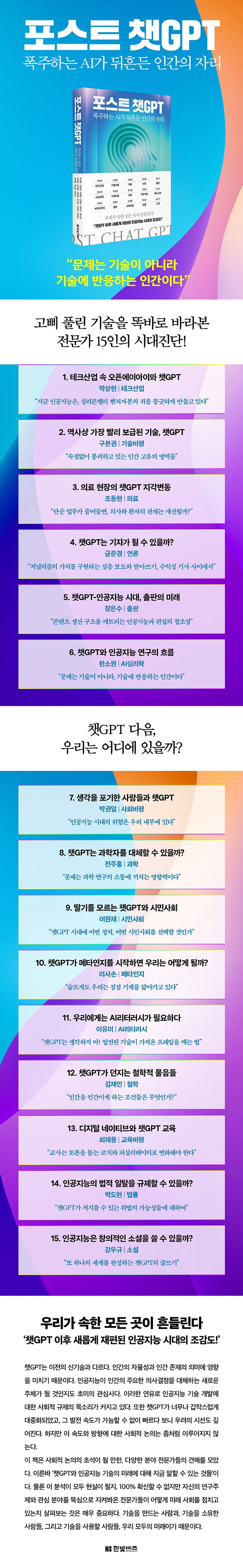 《포스트 챗GPT》는 이 대화의 초석이 될 전문가들의 견해를 모았다. 챗GPT가 의미심장한 변화를 일으키고 있는, 다양한 현장의 리포트들이다. 나아가 변화의 흐름을 추적하는 메타 비평도 담았다. 법률, 언론, 출판, 의료, 과학연구, 교육 현장, 거버넌스(시민사회)를 망라하는 현장 조감도부터 AI리터러시, AI심리학, 메타인지, 기술비평, 미디어 사회학적 전망까지 전문가 15인의 ‘시대진단’이다.