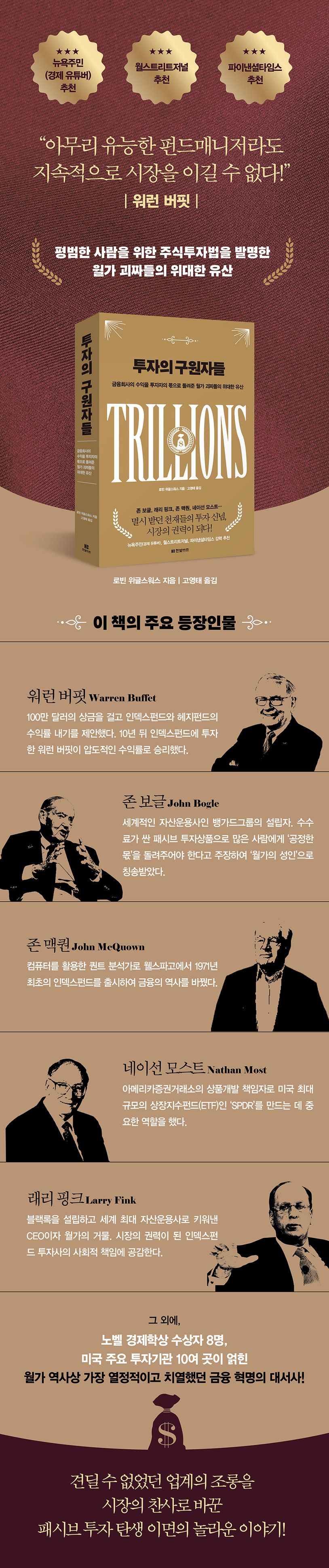 복잡하고 때로는 상충하는 장면들을 훌륭하고도 놀라운 하나의 이야기로 직조해낸 그는 우리가 당연하다고 여기는 패시브 투자 전략의 대중화를 위해 분투했던 사람들을 재조명하고, 금융 역사를 완전히 뒤바꾼 현대 금융의 결정적 순간과 그 주역들의 행적을 좇는다. 누구나 주식으로 성과를 낼 수 있도록 투자의 민주화를 이루어낸 천재들의 열정적 신념과 투지에 경외감이 드는 순간 당신의 투자에 대한 확신 또한 강력해질 것이다.