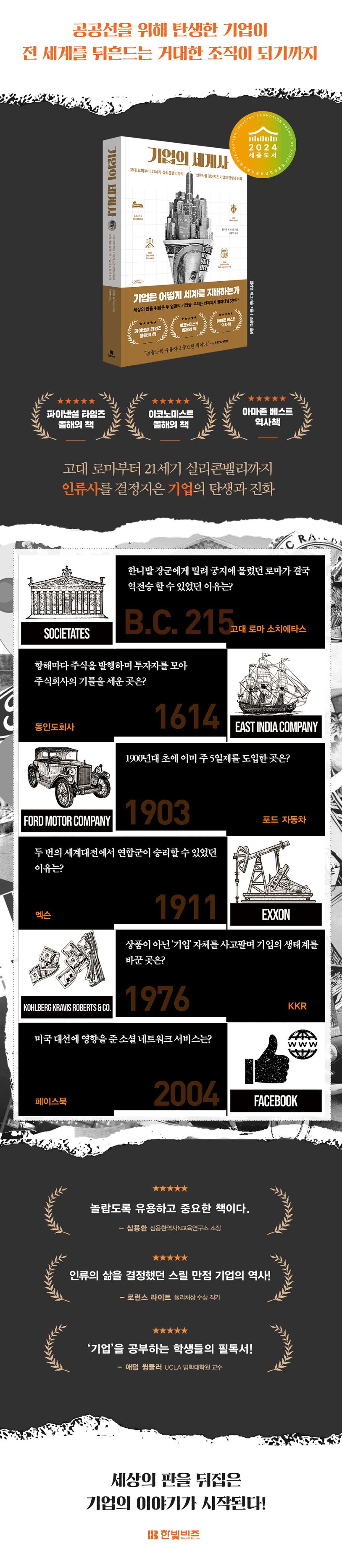 이 책은 고대 로마부터 오늘날까지 인류의 삶에 크게 영향을 주었던 ‘기업’의 역사를 훑어보며, 기업이 존재하는 이유와 기업의 역할에 대해 되묻고 있다. 기업의 목적은 무엇인가? 기업을 국가의 발전과 번영의 원동력이라 생각하는 시선도 있지만, 그 반대편에는 기업이 희생을 강요하고 이윤만을 추구하는 이기적인 집단이라는 시선도 존재한다.