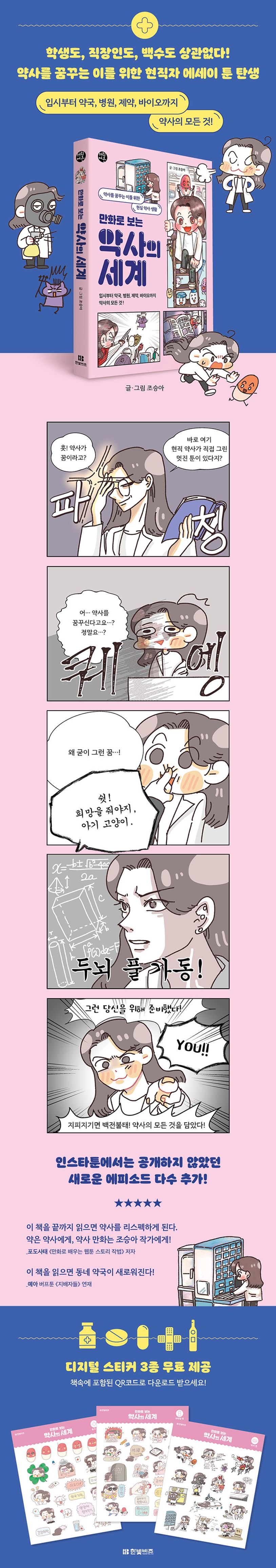 약사를 꿈꾸는 이를 위한 현직 약사 툰! 현직자의 생생한 이야기를 들어볼 수 있는 커리어툰의 세 번째 책이 출간됐다. 이번에는 우리의 건강을 책임지는 약 전문가이자 건강 상담사인 약사의 삶을 들여다본다. 이 책은 학생과 약대생, 제2의 직업으로 약사를 꿈꾸는 모든 이들을 위한 안내서이자, 병원과 약국을 돌며 일하다 결국 자신의 약국을 차려버린 현직 약사의 고군분투 약사 생활기이다. ‘약사의 모든 것’을 알고 싶다면 꼭 읽어야 할 책!