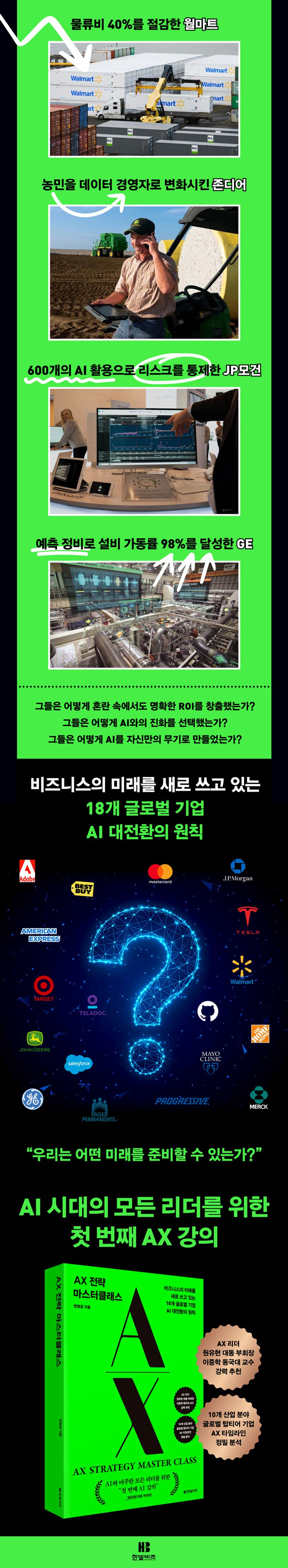 《AX 전략 마스터클래스》는 AI와 함께 진화하고 있는 18개 글로벌 기업의 실제 AX 사례를 통해 추상적인 기술 담론을 넘어 AI를 조직의 전략적 무기로 전환하는 구체적인 방법을 보여준다. KT와 BC카드에서 AI·디지털 트랜스포메이션을 진두지휘한 저자는 이렇게 강조한다. “AI 시대의 경쟁력은 가장 많은 로봇을 가진 기업이 아니라, 인간과 기계의 경계를 가장 현명하게 설계한 기업에게 돌아간다.”