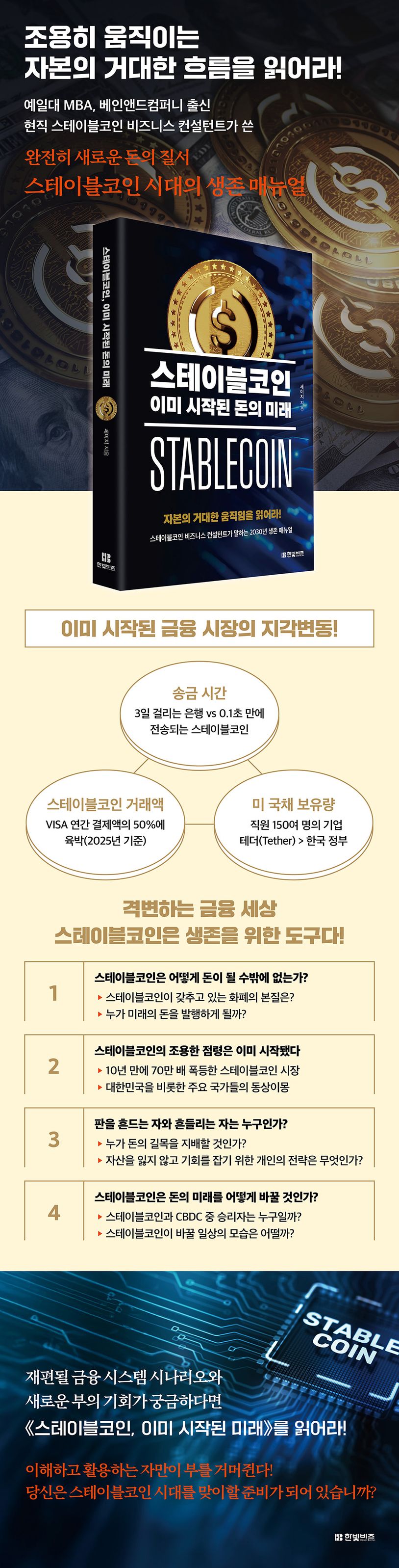 지금 우리에게 중요한 질문은 ‘스테이블코인이 무엇이냐’가 아니다. ‘스테이블코인을 어떻게 이해하고 접근하여 활용할 것인가’이다. 스테이블코인이 주요 화폐로 자리잡을 근미래 금융시장의 판도는 지금과 크게 다를 것이다. 기업만의 문제가 아니다. 국가와 개인 모두에 해당한다. 이미 시작된 자본의 거대한 이동을 구조적으로 설명한 이 책을 통해 미래의 기회는 어디에 있으며 리스크는 무엇인지 알아보자. 미래 부의 길목을 이해하는 시작이 될 것이다.
