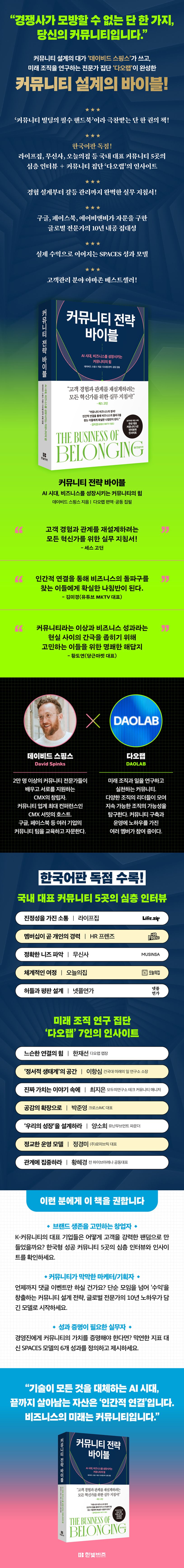 특히 한국어판에는 미래 조직과 일을 연구하는 커뮤니티 ‘다오랩’이 편역과 공동 집필로 참여해 ‘커뮤니티 빌딩 바이블’로서의 완성도를 높였다. 한국어판 독점 수록으로 무신사, 오늘의집, 라이프집 등 국내 대표 커뮤니티 5곳의 심층 인터뷰, 다오랩 멤버들의 인사이트가 추가되어 보다 현실적인 감각을 더해준다.