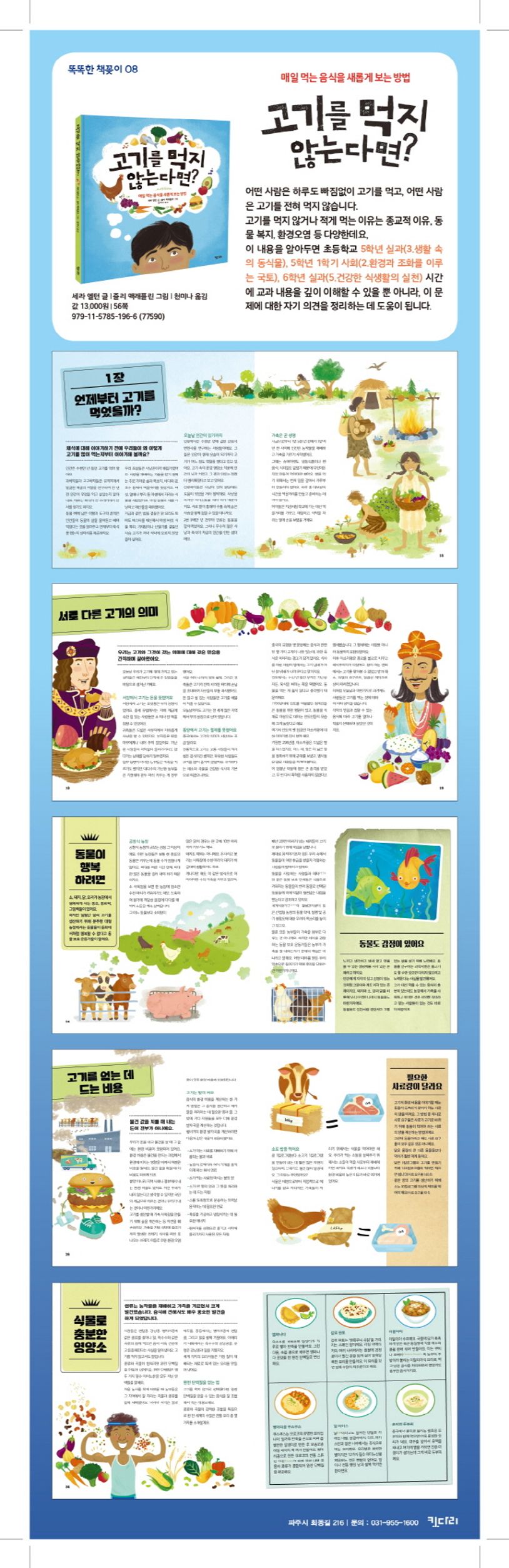 하지만 이 책은 모든 사람이 고기를 먹지 말아야 한다고 주장하지 않습니다. 어떤 음식을 먹든 그것은 개인의 선택이며, 각자의 선택을 존중해야 하기 때문이지요. 채식에 관심이 있다면 실제로 경험해볼 수 있도록 채식 요리에 대한 정보를 수록했습니다. 키다리 어린이 교양 시리즈 똑똑한 책꽂이 8권.