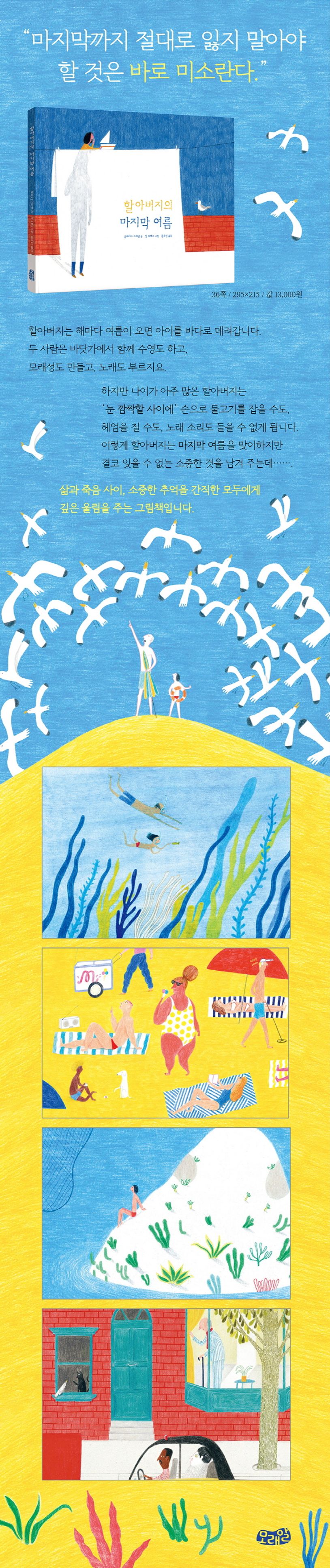 삶의 끝자락, 기력을 잃어 가면서도 웃음과 유머를 잃지 않는 할아버지, 할아버지와 함께 보낸 순간을 소중하게 간직하는 아이의 경험을 담담하게 담았다. 삶과 죽음, 추억이 가진 힘에 대한 이야기를 한여름의 바닷가를 배경으로 한 밝은 그림으로 표현해 눈길을 끈다.