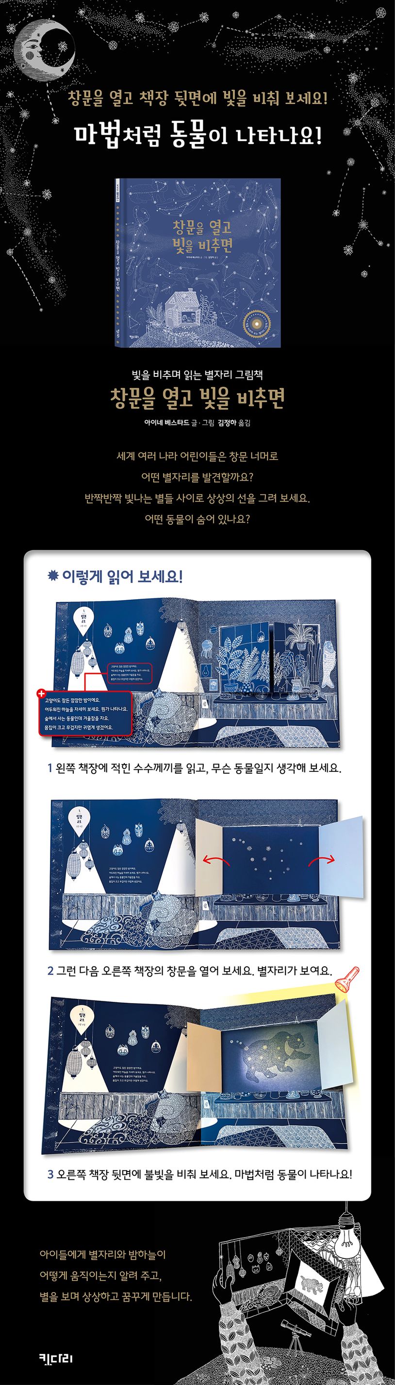 세계 여러 나라 어린이들은 창문 너머로 어떤 별자리를 발견할까요? 반짝반짝 빛나는 별들 사이로 상상의 선을 그려 보세요. 어떤 동물이 숨어 있을까요?