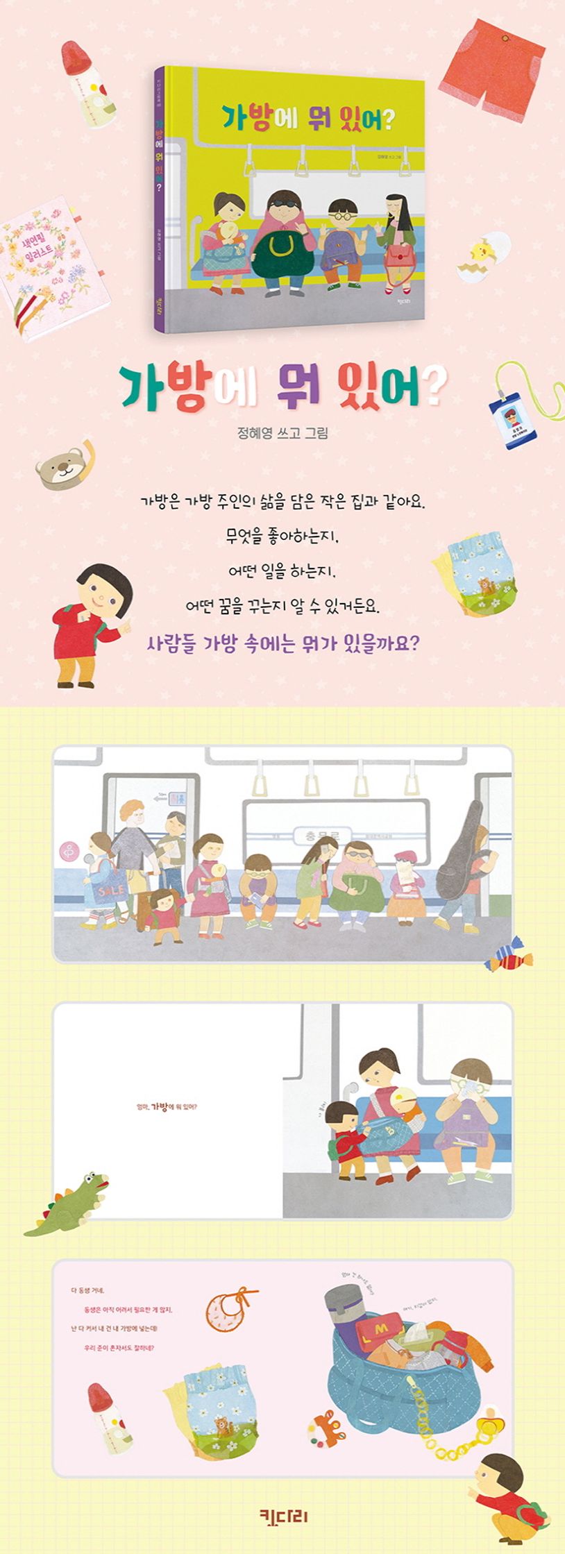지하철을 탄 호기심 많은 아이는 다른 사람들의 가방 속이 궁금합니다. 사람들의 가방 속에는 무엇이 들어 있을까요? 가방은 가방 주인의 삶을 담은 작은 집과 같습니다. 그 사람이 무엇을 좋아하는지, 어떤 꿈을 꾸는지. 어떤 직업을 가졌는지도 살펴볼 수 있지요. 가방 속 물건을 통해 다른 사람의 삶을 이해하고, 가방 속을 들여다보는 재미를 느낄 수 있습니다.