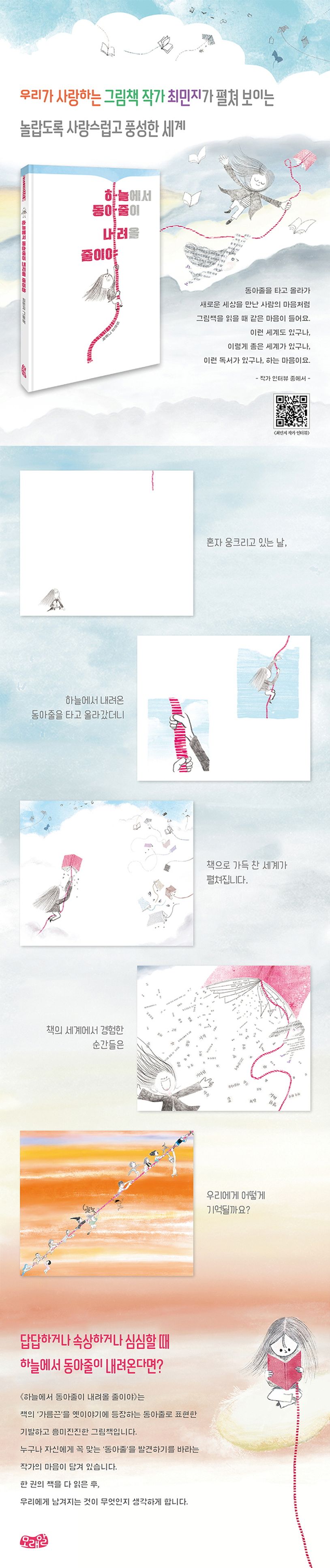 한국 옛이야기에서 ‘동아줄’은 위기의 순간에 다가오는 구원의 손길을 의미한다. 작가 최민지는 ‘책의 가름끈’을 동아줄에 빗대어 표현한다. 우리가 답답하거나 속상하거나 심심할 때 도움을 주는 것이 다름 아닌 책이라는 의미다.