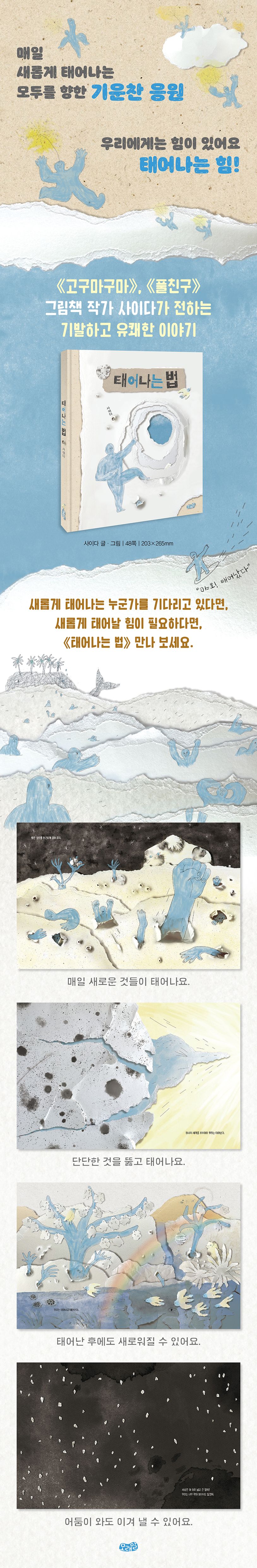 《고구마구마》, 《풀친구》에서 ‘고구마들’과 ‘잔디들’의 목소리를 담아낸 사이다 작가는 《태어나는 법》에서 ‘생명’의 목소리를 담았다. 다양한 생명이 태어나는 순간을 담고 있는 그림책으로, 배 속의 아기에게 읽어 주거나, 호기심 많은 어린이와 함께 읽으면 좋다.