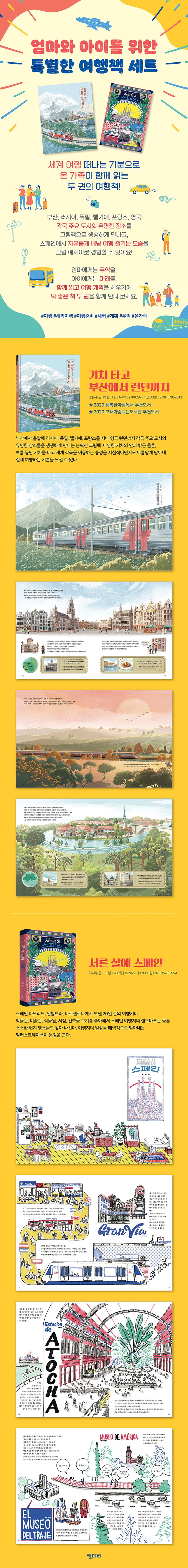 〈엄마와 아이를 위한 특별한 여행책 세트〉는 세계 여행을 떠나는 기분으로 만날 수 있는 두 권의 책을 함께 묶었다. 각기 다른 분야의 책이지만 ‘여행’이라는 콘셉트로 이어져 있으며, 아이와 양육자가 함께 보고 이야기 나누기 좋은 책들로 골랐다. 《기차 타고 부산에서 런던까지》는 부산에서 출발해 러시아, 독일, 벨기에, 프랑스를 지나 영국 런던까지, 각국 주요 도시의 유명한 장소들을 생생하게 만날 수 있는 논픽션 그림책이다. 온 가족이 함께 세계 여행을 떠나는 내용으로 구성되어 있어 여행하는 기분을 느낄 수 있으며, 실제 여행을 준비할 때 참고하기도 좋다. 《서른 살에 스페인》은 젊은 시절 배낭 여행으로 다녀온 유럽을 떠올리게 하는 그림 에세이다. 혼자 여행을 떠나던 그때 그 시절의 추억을 떠올리는 것은 물론, 아이와 함께 읽고 스무 살이 넘은 아이가 혼자 떠날 미래의 여행에 대해 이야기를 나눌 수 있다.