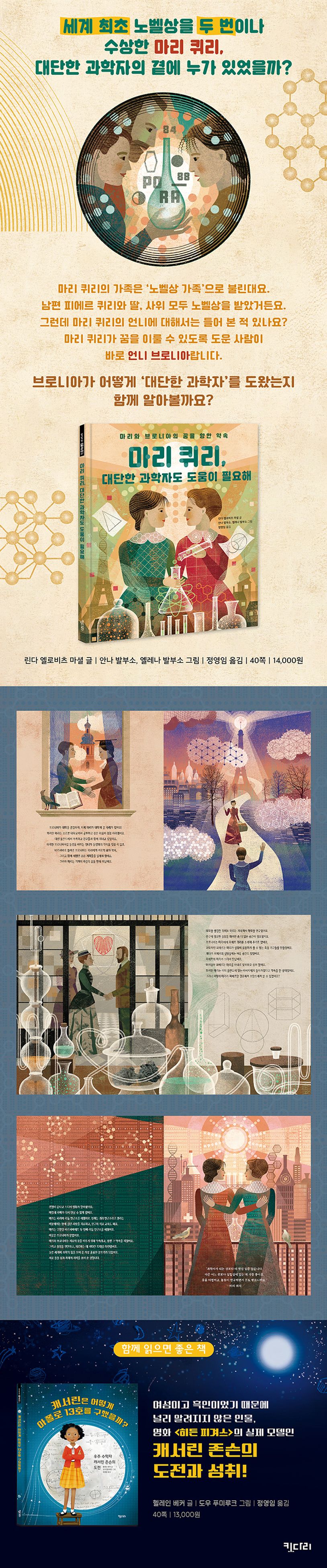 《마리 퀴리, 대단한 과학자도 도움이 필요해》는 세상을 바꾼 과학자 마리 퀴리와 그동안 잘 알려지지 않았던 마리 퀴리의 언니 브로니아의 끈끈한 자매애를 조명한 논픽션 그림책입니다.