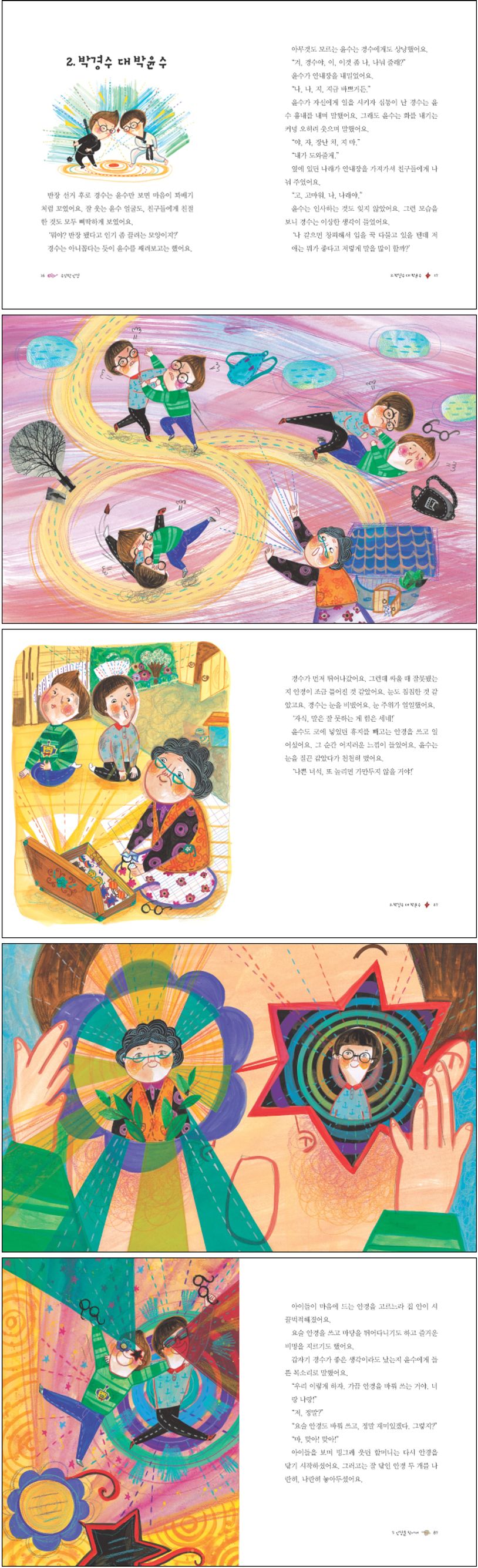 나는친구의마음을얼마나이해하고있을까?나와조금다르다고해서친구를놀리거나무시하지않았는지?분명그친구는말한마디를걸기위해큰용기가필요했을텐데말이다.말을더듬는윤수가답답한경수는용기내어다가온윤수를놀려댄다.윤수또한자신을이해해주지않는경수가밉기만하다.서로를이해하지못한두아이는결국멱살을잡고바닥을뒹굴며싸우기까지한다.친구를이해하는가장좋은방법은무엇일까?그것은입장을바꿔생각해보는것이다.나에게는별거아니고쉬운일이내친구에게는중요하고어려운일이될수도있다는점을알아야한다.진정한친구가되기위해서는서로에대한이해가필요하다.내가그친구가되어보고,그친구는내가되어본다면서로의입장을충분히이해할수있고,친구는나와다른생각을할수도있다는것을알게될것이다.나도나만의개성이있듯이내친구도자신만의개성이있다.진정한친구가되기위해서는각자다른개성을인정하고맞춰가는과정에서진실한우정이만들어진다는것을명심하자.줄거리오늘은반장선거가있는날이다.반장하고싶은사람손들어보라는선생님말씀에경수가손을번쩍들었다.경수짝인나래도손을들더니윤수를반장으로추천했다.또박또박반장후보연설을한경수와말을더듬는윤수.하지만경수의기대와달리윤수가반장이되었다.말더듬는애를반장으로뽑은반친구들을이해하지못하는경수는잘웃는윤수가못마땅하다.집에가는길에말더듬는윤수를이해하지못하는경수와자신을놀리는경수가미운윤수는결국서로의멱살을잡고주먹질을해대면서길바닥을뒹굴었다.마침대문을열고나온할머니가두아이의싸움을말리고,상처난얼굴에약을발라주시고,지저분해진아이들의안경도닦아주셨다.그러고는방에서오래된나무상자를내오셨다.그상자안에는재미있고신기하게생긴안경이가득담겨있는게아닌가.아이들은시간가는줄모르고신기한요술안경구경을빠졌다.집으로돌아온경수는갑자기생각대로말이나오지않아말을더듬거렸다.엄마심부름으로삼겹살을사러간경수는말못하는아이취급을당하자속상한마음에눈물이와락쏟아졌다.윤수또한깜짝놀랐다.마술에걸린듯말이술술나오는것이아닌가.줄줄막힘없이나오는자신의목소리가마냥신기한윤수는소리내어책을읽고,신나게노래도부르며그동안해보지못한것들을마음껏한다.다음날윤수와싸운후로자신이이상해진것을알게된경수는어제만났던할머니집마당을엿보다가깜짝놀란다.분명할머니는화분에물을주고있는데빨래가저절로날아가빨랫줄에널리는것이아닌가.할머니가자신한테마법을썼다고생각한경수는윤수와함께할머니집으로간다.할머니는경수와윤수에게직접경수의안경을찾아보라고하신다.할머니가주신‘가깝고따듯하다.’라는힌트로윤수와경수는할머니집마당여기저기를살펴봤지만경수의안경은보이지않았다.윤수가경수를위로하며손을잡는순간,경수의손이부르르떨렸다.가깝고따듯한건바로윤수인것이다.하지만말을잘하게되었다고좋아하는윤수한테자신의안경과바뀌었다는말을차마할수없었다.잠시말이없던윤수는쓰고있던안경을벗어경수에게주었고,안경을받아든경수는안경을쓰는순간눈이환해지고말도잘나왔다.반면윤수는예전처럼말을더듬게되었다.겨우하루였지만윤수가얼마나힘들고답답한지알게된경수는누구보다윤수의마음을잘알것같았다.이제경수는윤수의말을끝까지들어주었다.그러고는가끔서로의안경을바꿔쓰기로약속했다.