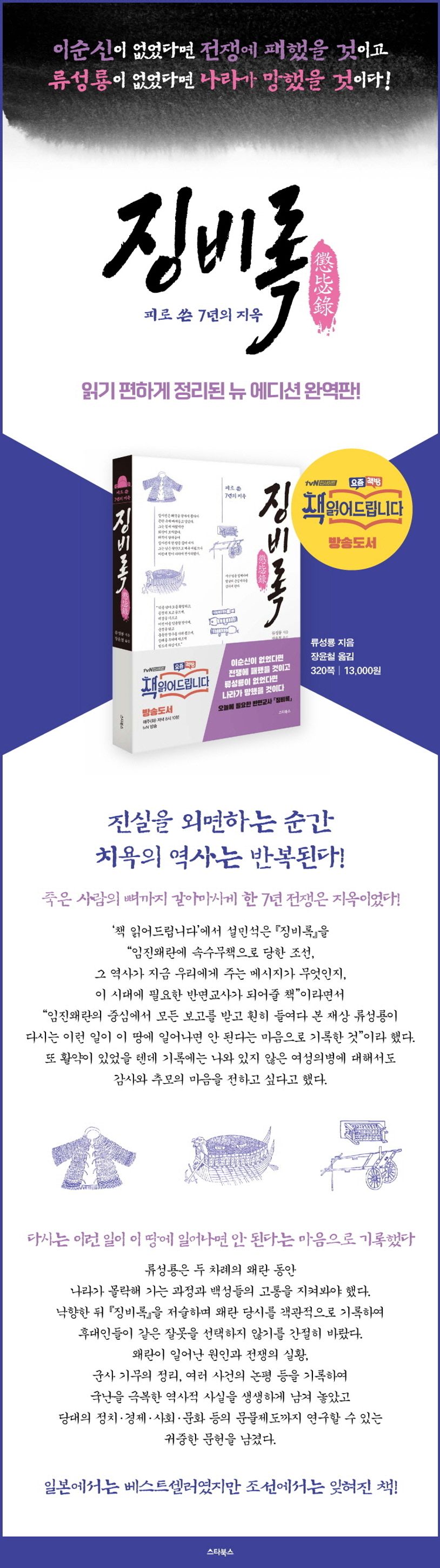 ‘책 읽어드립니다’에서 설민석은 『징비록』을 “임진왜란에 속수무책으로 당한 조선, 그 역사가 지금 우리에게 주는 메시지가 무엇인지, 이 시대에 필요한 반면교사가 되어줄 책”이라면서 “임진왜란의 중심에서 모든 보고를 받고 훤히 들여다 본 재상 류성룡이 ‘다시는 이런 일이 이 땅에 일어나면 안 된다는 마음으로 기록한 것’이다. 특히, 조선은 200년간 지속된 평화 때문에, 온 나라 백성이 편안함에 익숙해져 있었고, 전쟁이 날 것이라는 위기감이 없었기에 일본군의 공격에 속수무책으로 당할 수밖에 없었다. 따라서 ‘무탈’하게 살라는 말은 악담이라 생각한다. 잦은 고통은 사람을 강하게 한다. 위기를 고통스럽게만 생각할 게 아니라 기회가 될 수 있다는 것을 『징비록』을 통해 배울 수 있다”고 했다. 또한 남자 의병 못지않게 여자 의병들의 활약도 있었을 텐데 그 기록이 없어 안타깝다고 털어놨다. 또 “다시 한 번 전쟁에서 나라를 지키기 위해 고통 받은 여성의병들에게 감사와 추모의 마음을 이 자리를 빌어 전하고 싶다”고 했다.