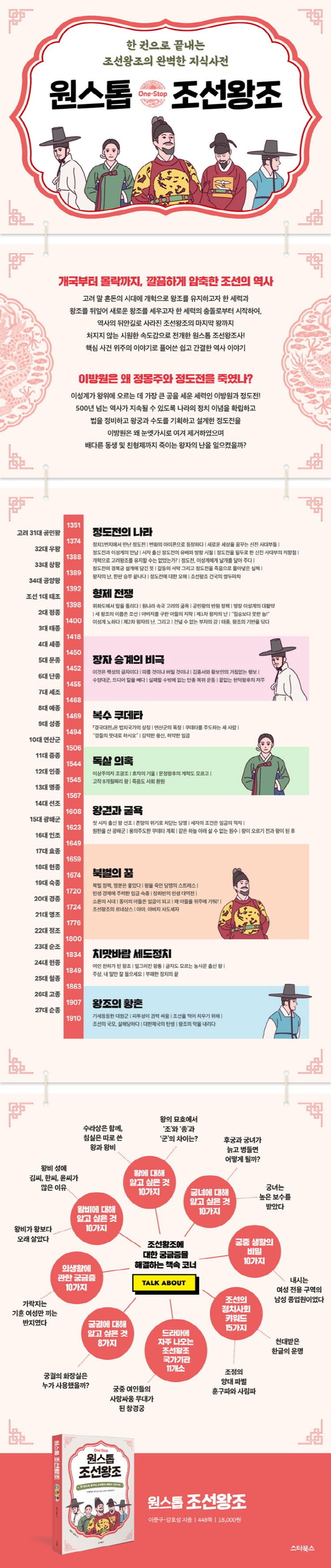 『원스톱 조선왕조』는 고려 말 혼돈의 시대에 개혁으로 왕조를 유지하고자 한 세력과 왕조를 뒤엎어 새로운 왕조를 세우고자 한 세력의 충돌로부터 시작하여, 역사의 뒤안길로 사라진 조선왕조의 마지막 왕까지를 처지지 않는 시원한 속도감으로 전개하고 있다. 기계적으로 서술한 지루한 역사 연대기가 아니라 핵심 사건을 이야기로 풀어 역사를 쉽게 이해하게 만드는 작가의 저력이 뛰어나다.