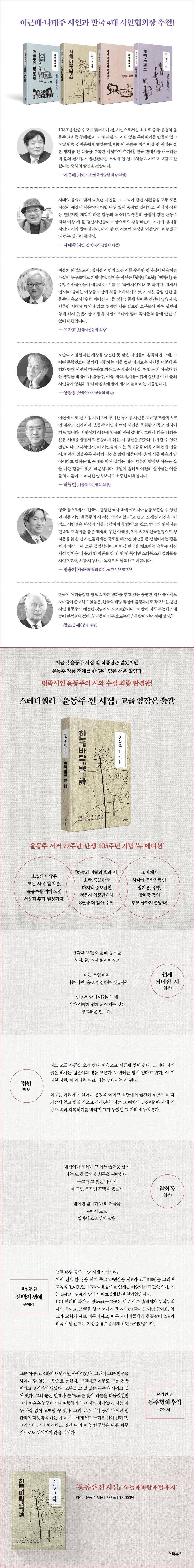 윤동주 서거 77주년을 기념하기 위해 고급양장본으로 제작된 이 시집은, 총 4부로 구성되어 있던 『윤동주 전 시집』을 8개의 장으로 재구성하였다. 또한 발간 당시 시가 추가될 때마다 실린 추모 글들을 마지막 8장에 모아 독자들 누구나 쉽고 편하게 읽을 수 있고 이해할 수 있도록 정성들여 편집했다.