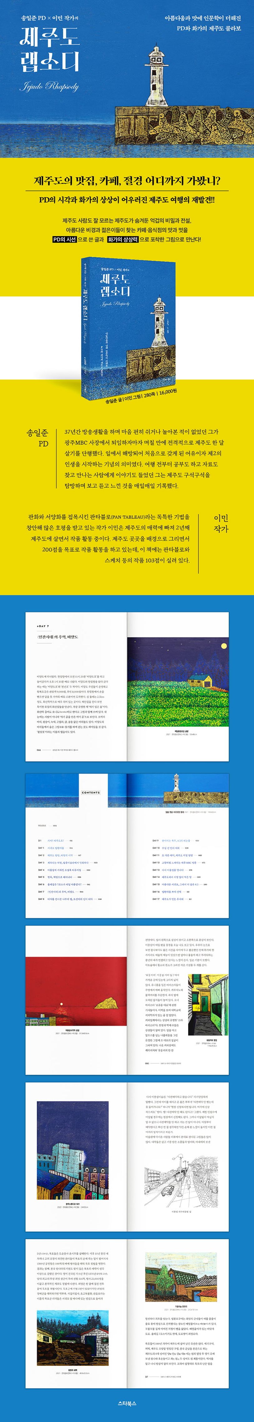 제주도를 사랑한 두 사람이 쓰고 그린 ‘제주도 랩소디’는 제주도의 아름다운 비경과 음식점을 찾는 즐거움과 여행자들이 즐겨 찾는 카페와 색다른 뮤지엄, 그리고 제주도의 전설에 인문학이 더해진 여행서로 독자들은 제주여행의 재미가 꼬리를 물것이다.