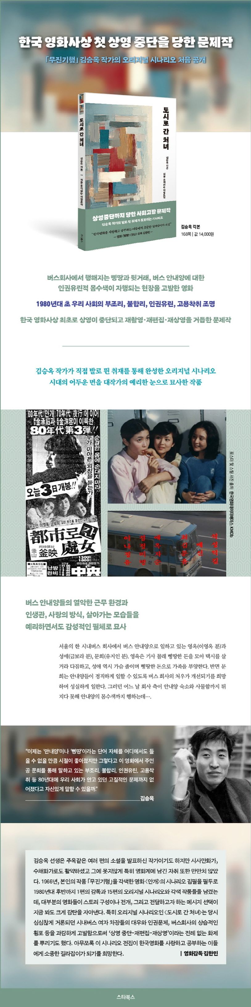 〈도시로 간 처녀〉는 김승옥 작가가 새벽부터 늦은 밤까지 버스회사와 안내양의 취재를 통해 완성한 오리지널 시나리오다. 따라서 시대의 어두운 면을 대작가의 예리한 눈으로 직접 목격한 작품으로 작가의 감수성과 문학성까지 겸비한 명작이다. 모든 버스에 안내양이 있던 시기에 버스와 버스회사에서 행해지는 삥땅과 뒷거래 그리고 안내양에 대한 인권유린적 몸수색이 자행되는 현장을 고발한 영화다.