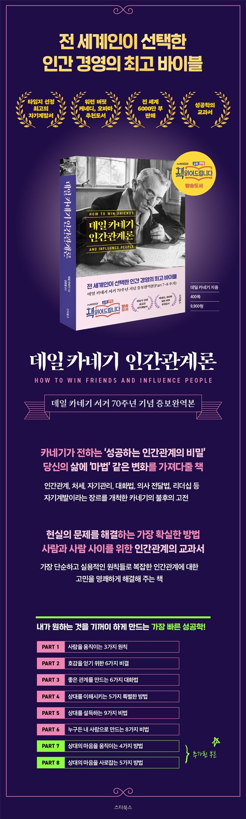 카네기 서거 70주년 기념으로 전 세계인들이 읽고 선택한 인간관계 최고의 자기계발서인 『인간관계론』은 케네디, 레이건, 부시, 오바마 등 미국의 대통령들과 오프라 윈프리, 스티븐 코비가 곁에 두고 읽었으며, 워런 버핏은 자신의 인생을 바꿔준 책이라고 적극 추천한 책이다. 이 책은 사람을 다루는 핵심 원리를 효과적으로 설명하고 있다. 젊어서 카네기를 모르면 아는 사람을 절대 이길 수 없다는 말이 있을 정도로, 성공을 꿈꾸는 젊은이들에게 이 책은 한 세기를 지나 오늘을 사는 우리에게도 여전히 막대한 영향력을 발휘하고 있다. 데일 카네기의 『인간관계론』은 서양에서 성경처럼 읽는 책이다. 거기에는 분명 이유가 있을 것이다. 그것은 무엇이며 왜 이토록 모든 세계인들의 열성적인 관심을 받는가?