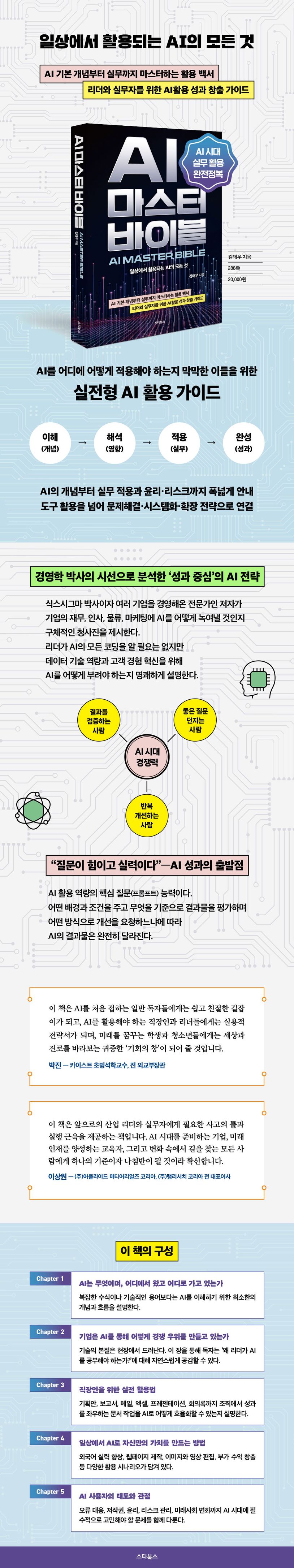 AI는 더 이상 ‘미래의 기술’이 아니다. 출근길 내비게이션, 콘텐츠 추천, 고객 상담, 재고 예측, 채용과 평가까지-우리가 의식하지 않는 사이 AI는 이미 산업과 일상의 기본 값이 되었다. 그러나 많은 사람에게 AI는 여전히 “어디서부터, 무엇을, 어떻게 적용해야 하는지”가 막막한 영역이다. 『AI 마스터 바이블』은 이 막막함을 “이해(개념) → 해석(영향) → 적용(실무) → 완성(성과)”의 흐름으로 정리한 실전형 AI 활용 가이드다. AI의 기본 개념과 작동 원리를 알기 쉽게 풀어내는 동시에, 기업 리더를 위한 전략적 활용 프레임과 조직 구성원을 위한 문서·엑셀·PPT·메일 등 업무 적용 방법, 그리고 개인의 일상 활용(외국어, 글쓰기, 이미지·영상, 개인 튜터, 부가수익 등)까지 폭넓게 다룬다. 더 나아가 AI 시대의 저작권·윤리·리스크 관리와 미래사회 전망도 함께 제시해 독자에게 전한다.