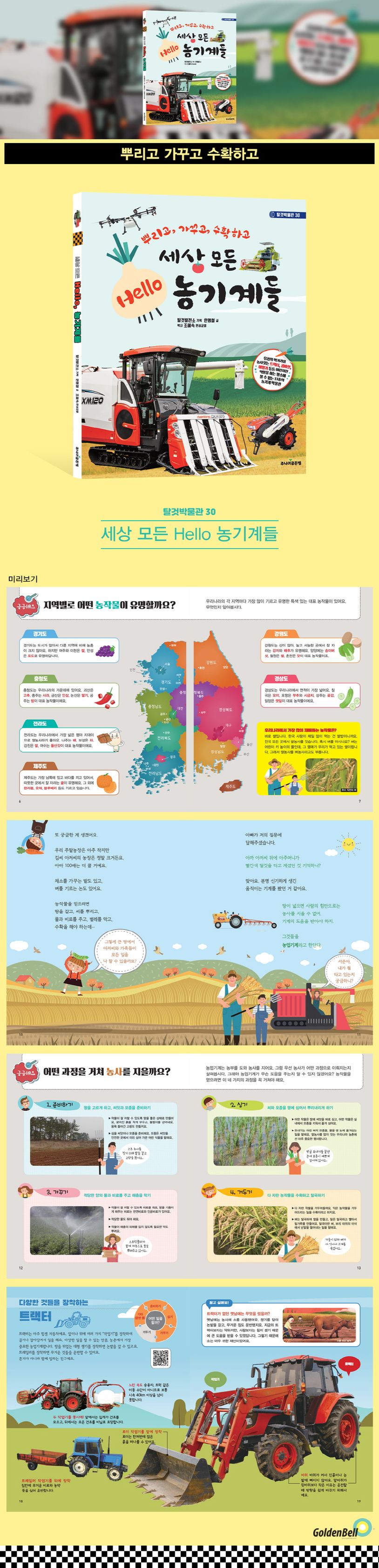 다양한 장비를 장착하는 슈퍼 트랙터, 씨앗을 심는 파종기와 모를 심어주는 이앙기, 이삭을 거두는 수확기와 탈곡까지 해주는 콤바인 등 신기하고 재밌는 농기계 세상을 탐험해 봐요.