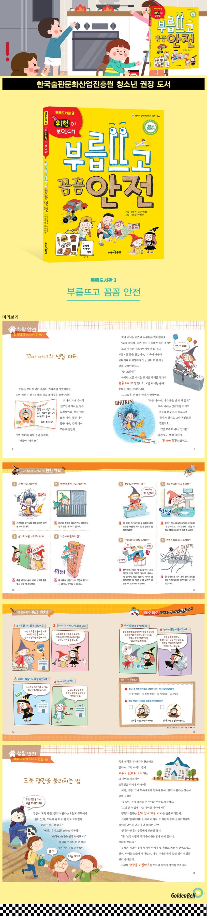 《위험이 보인다! 부릅뜨고 꼼꼼 안전》에는 25개의 재미있는 동화가 들어 있어요. 아이는 흥미진진한 동화를 읽으면서 꼭 지켜야 할 25가지 안전 규칙을 자연스레 습득하게 되지요. 또한 생활안전, 교통안전, 약물 및 식품안전, 유괴 및 실종 예방안전, 성폭력 및 아동학대 예방안전, 재난안전의 6가지 영역이 책 속에 총망라되어 있기 때문에, 언제 어디에서 일어날지 모르는 안전사고에도 아이는 당황하지 않고 침착하게 대처할 수 있게 됩니다.