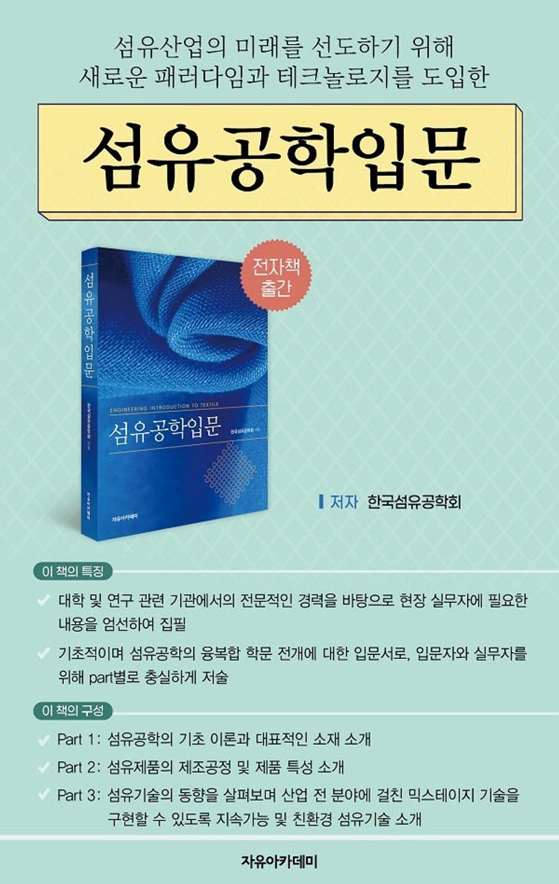 이러한 점을 감안하여 한국섬유공학회 제39대 집행부(회장 이무성 교수)에서는 다변화된 산업 시스템에서 섬유공학의 새로운 위상 구축과 융복합 학문으로서의 입지 전개를 위해 새로운 서적인 [섬유공학입문]을 발간하게 되었습니다. 이 책은 업스트림(섬유재료) - 미들스트림(섬유집합체 제조) - 다운스트림(섬유기술동향)을 중심으로 섬유공학을 공부하는 데 꼭 필요한 내용으로 구성하였습니다.