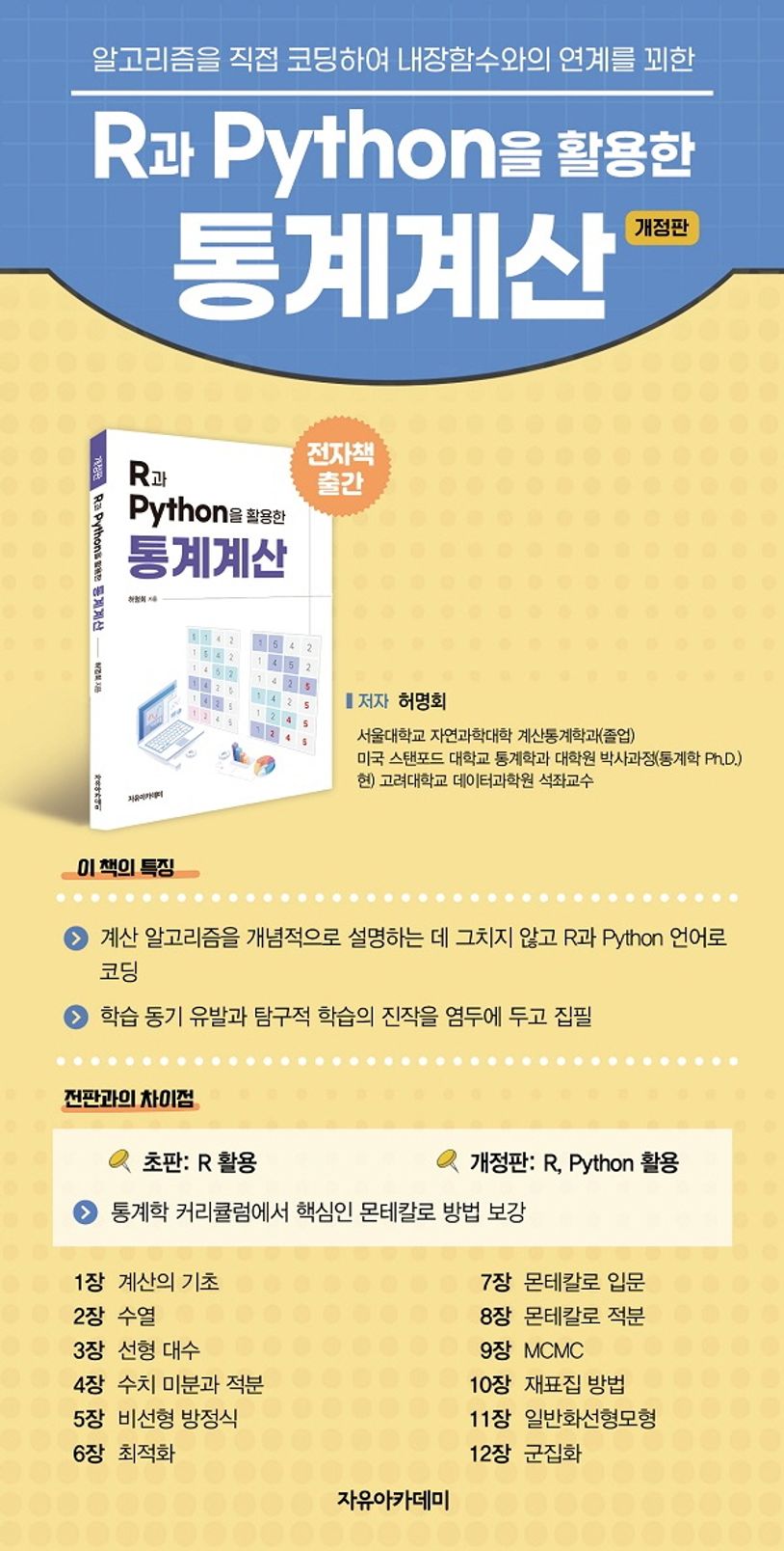 계산도구는 데이터과학에서 손꼽히는 두 언어인 R과 Python다. 모든 알고리즘을 직접 코딩하였고 내장함수(built-in functions)와의 연계를 꾀하였다. R과 Python 중 하나로도 이 책을 학습할 수 있다. 교재에 제시된 R과 Python 스크립트는 출판사 홈페이지(http://www.freeaca.com) 자료실에 올려져 있다. “copy and paste” 및 단순한 편집으로 응용이 가능하다.