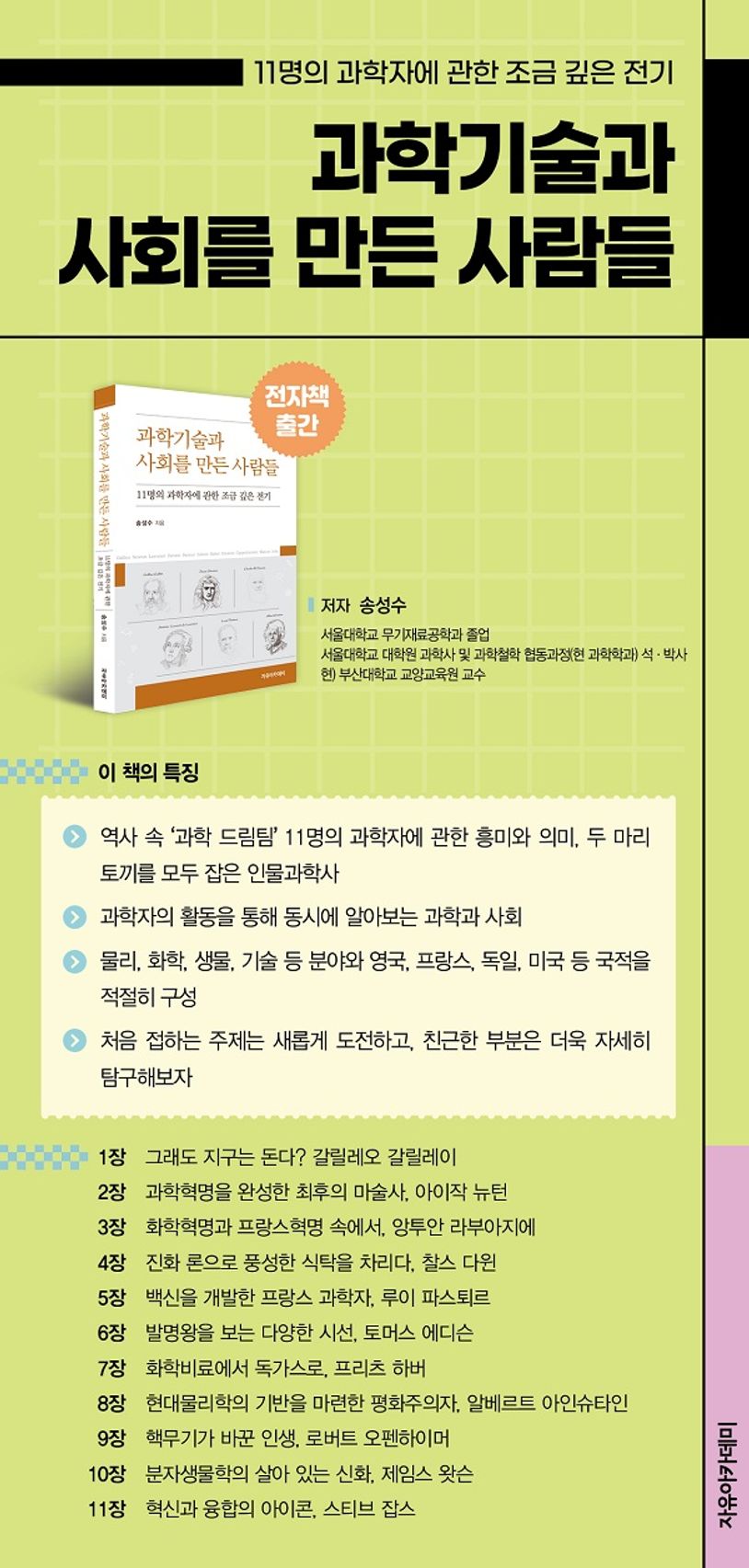 1장그래도지구는돈다?갈릴레오갈릴레이수도원에서대학으로진자의등시성에얽힌오해피사의사탑에대한신화낙하운동의법칙을찾아서망원경으로밝혀낸우주의비밀왜‘메디치의별’이었을까?동상이몽이된『천문대화』갈릴레오와종교재판운동의상대성과관성을제안하다실험과학의아버지?2장과학혁명을완성한최후의마술사,아이작뉴턴뉴턴이여,나타나라!뉴턴은어떻게대학에갈수있었나기적의해,1666년거인들의어깨에서서?자연철학의수학적원리를찾아서연금술에몰두한뉴턴뛰어난행정가로의변신최고과학자의논쟁법거대한진리의바다를헤맸던소년?3장화학혁명과프랑스혁명속에서,앙투안라부아지에과학아카데미의최연소회원세금관리인이된라부아지에산소는누가발견했는가?라부아지에의다양한연구근대화학의기틀을마련하다“공화국에는과학자가필요없다”4장진화론으로풍성한식탁을차리다,찰스다윈무르익은진화의관념부유한집안의생물학도비글호항해가남긴것은?진화의메커니즘을찾아서『종의기원』을출간하기까지진화론의파문대단한열정의소유자5장백신을개발한프랑스과학자,루이파스퇴르학습속도가느린까닭입체화학의길을열다결정학에서미생물학으로조국을위한실용적연구일반화된백신의원리프랑스의파스퇴르화?위험을무릅쓴과학자의인간적승리파스퇴르의문지기파스퇴르에대한다양한평가6장발명왕을보는다양한시선,토머스에디슨문제아에서전신기술자로전업발명가의길조직적발명을위하여멘로파크의마술사전기의시대를연백열등시스템구축가로서의에디슨웨스팅하우스와의‘전류전쟁’에디슨의문화코드계속되는도전과실패“신념을가져라.전진하라!”7장화학비료에서독가스로,프리츠하버질소비료의꿈여러대학을옮겨다니다연구자의경력쌓기암모니아를합성하기까지질소비료의대량생산독가스개발에앞장서다클라라의극단적선택“내평생에지금처럼유대인이었던적은없다”8장현대물리학의기반을마련한평화주의자,알베르트아인슈타인학교에잘적응하지못한소년“학자도다른직업을갖는것이좋다”현대물리학의기초를닦다수학적표현인가,물리적실재인가?뉴턴주의는무너졌다!유별난노벨상수상신의생각을알고싶다아인슈타인의실험실은어디에?평화를사랑한과학자아인슈타인이남긴명언9장핵무기가바꾼인생,로버트오펜하이머천재과학자로성장하다미국의이론물리학을일구다핵분열발견에서원자탄개발로맨해튼계획의전개“나는세상의파괴자가되었다”죽음의도시가된히로시마와나가사키원자탄이과학기술에미친영향“내손에피가묻어있다”수소폭탄의개발에반대하다청문회를선택한바보10장분자생물학의살아있는신화,제임스왓슨현대생물학의키워드,유전유전학자를위한최고의훈련왓슨과크릭의만남DNA의다크레이디,로절린드프랭클린“우리는생명의신비를풀었어”세상을바꾼1쪽분량의논문도마에오른『이중나선』인간유전체계획의산파11장혁신과융합의아이콘,스티브잡스입양으로시작된인생파란만장한학창시절“내면의목소리에귀를기울여라”애플컴퓨터의신화자신만의스타일을고집한보스잡스의성숙과부활아이시리즈로계속된혁신각장의기초가된글들참고문헌찾아보기
