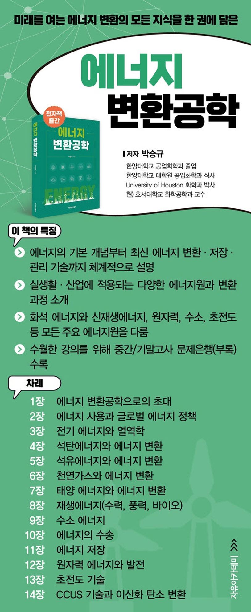 1장에너지변환공학으로의초대1.에너지는무엇인가?2.에너지변환과정3.에너지관련단위연습문제2장에너지사용과글로벌에너지정책1.에너지사용과지구온난화2.신·재생에너지3.글로벌에너지정책4.EU그린택소노미연습문제3장전기에너지와열역학1.전기에너지2.자동차에서의전기3.발전과정에서의에너지변환과에너지효율성연습문제4장석탄에너지와에너지변환1.석탄에너지와에너지변환2.원료로서의석탄3.석탄화력발전연습문제5장석유에너지와에너지변환1.석유에너지2.원유의생성과채취기술3.원유의증류4.Shalegas/타이트오일5.오일샌드연습문제6장천연가스와에너지변환1.천연가스에너지112.LNG운반선과조선산업3.천연가스액화공정에서의열역학4.LNG와냉열에너지산업연습문제7장태양에너지와에너지변환1.태양에너지2.태양에너지의전기에너지로의변환3.태양열발전4.태양열온수시스템및냉방/난방5.발전효율향상기술6.태양광수소생산연습문제8장재생에너지(수력,풍력,바이오)1.수력에너지2.풍력에너지3.바이오재생에너지연습문제9장수소에너지1.수소는무엇인가?2.수소에너지의물리화학3.수소에너지의제조4.수소에너지저장기술5.수소의활용:자동차및항공분야6.기타산업분야에서의수소연료의사용연습문제10장에너지의수송1.에너지의수송2.에너지수송에서손실을줄이는기술연습문제11장에너지저장1.빙축열에너지저장기술2.에너지저장시스템3.새로운에너지사업,ESS연습문제12장원자력에너지와발전1.수소핵융합에너지2.핵분열과원자력발전3.우리나라및세계각국의원자력발전현황4.핵연료재처리기술5.핵연료의분포와매장량연습문제13장초전도기술1.초전도기술연습문제14장CCUS기술과이산화탄소변환1.CCUS기술과이산화탄소변환연습문제부록연습문제해답중간고사문제기말고사문제참고문헌