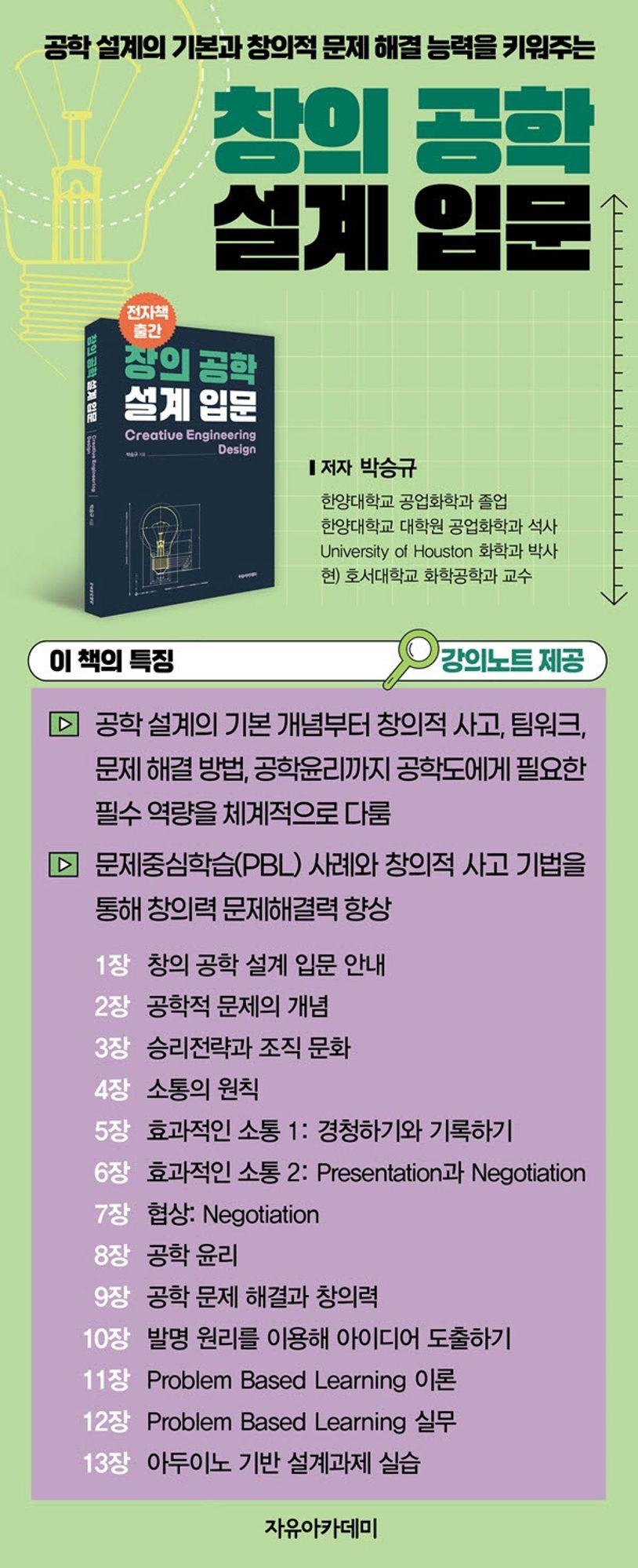 1장창의공학설계입문안내1.창의공학설계란무엇인가?2.공학교육인증제도와창의설계3.공학과공학자4.공학적창의력으로세상을바꾼15가지유명특허-연습문제-2장공학적문제의개념1.공학적문제의개념2.공학적문제해결방법3.공학설계프로세스와제한조건4.공학설계에서의실패원인과대책5.일반적인설계프로세스6.공학설계프로세스7.공학설계프로세스의시작:문제정의하기-연습문제-3장승리전략과조직문화1.토끼와거북이의승리전략2.바람직한팀과조직문화3.나의사고유형파악하기4.NedHerrmann의두뇌유형모델및역량키우기5.팀구성6.팀워크빌드업7.팀회의진행-연습문제-4장소통의원칙1.자존감2.자존감을높이는방법과팀워크속소통원칙3.자존감과자존심4.소통의미학5.소통의원칙-연습문제-5장효과적인소통1:경청하기와기록하기1.효과적인소통①:경청하기2.효과적대화유도를위한경청기법3.효과적인소통②:기록하기4.효과적인소통③:기술보고서쓰기-연습문제-6장효과적인소통2:Presentation과Negotiation1.효과적인소통①:Presentation2.Presentation잘하기:준비와발표3.효과적인소통②:Win-WinGame-연습문제-7장협상:Negotiation1.거란의1차고려침략과서희의협상2.서희의협상에서배우는협상원리3.협상의원리4.원칙론적협상법-연습문제-8장공학윤리1.기업윤리2.윤리경영3.화학공학과공학윤리4.ESG경영5.기업가정신:창의적도전의씨앗-연습문제-9장공학문제해결과창의력1.창의력,왜중요한가?2.창의적공학문제해결3.창의력향상하기-연습문제-10장발명원리를이용해아이디어도출하기1.특허란무엇인가?2.트리즈발명원리와특허3.창의적사고기법:ASIT4.ASIT문제해결기법-연습문제-11장ProblemBasedLearning이론1.문제중심학습이란?2.PBL의설계단계3.효과적인문제설계의조건4.PBL의실제적용에서기대되는변화5.창의설계입문교과목에서의PBL적용방안-연습문제-12장ProblemBasedLearning실무1.실제사례를통해본PBL학습2.첫번째PBL용문제제시과정3.두번째문제해결을위한자료수집단계4.세번째문제재확인및문제해결안도출단계5.네번째문제해결안발표및학습결과정리·평가단계-연습문제-13장아두이노기반설계과제실습1.공학설계에서의아두이노활용2.스마트홈시스템의이해3.아두이노활용법4.설계과제실습사례5.종합정리-연습문제-참고문헌"