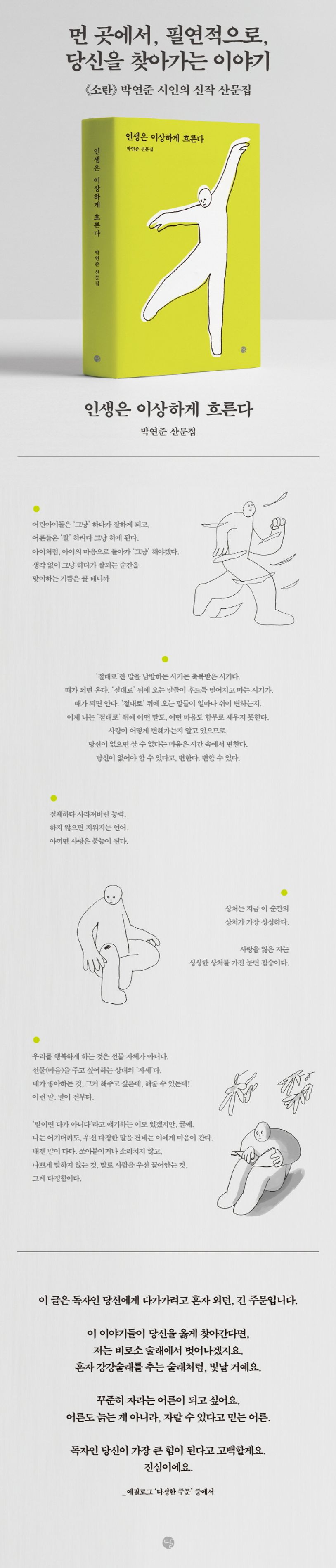 “인생은 이상하게 흐른다”는 단순하고 분명한 사실을. 2004년 등단 후 《속눈썹이 지르는 비명》 《아버지는 나를 처제, 하고 불렀다》《베누스 푸디카》 세 권의 시집을 통해 독자와 만났고, 첫 산문집 《소란》으로 특유의 호기심 어린 시선을 보여주며 인생의 한 시절을 이야기한 박연준 시인이 신작 산문집을 펴냈다. 이번 산문집 《인생은 이상하게 흐른다》는 먼 곳에서 아주 먼 곳에서, 이야기 꾸러미를 들고 독자인 당신을 찾아온 시인의 발걸음이다. 이야기를 들어줄 당신과 이야기를 들려줄 시인은 ‘엄청난 우연’으로 혹은 필연으로 만날 것이다. 책에서 저자는 숨쉬듯 자연스럽게 살아가되, 다정함의 자세를 유지하고, 또 열심히 발레교습소에 나가 몸을 곧게 펴고 길게 늘이는 일상들을 보여준다. 또 그 속에서 날카롭게 포착해낸 삶의 진리와, 시인이 인생을 대하는 곧은 시선을 특유의 유머러스하고 따뜻한 필치로 그렸다.