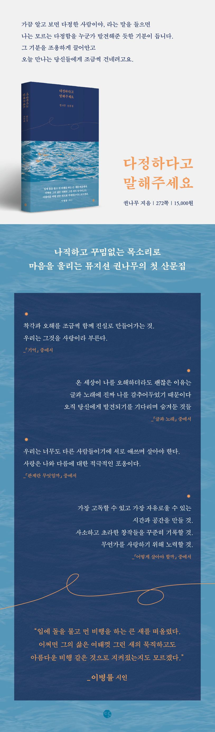 ‘다정’이 아우르는 것은 하늘보다 높고 바다보다 넓어서 어느 날 무심히 건네는 말 한마디만으로도 우리는 금세 ‘다정’이라는 명사에 물든다. 때로 “밥 먹었어?” “잘 지내지?” 같은 일상적인 안부 인사에도 큰 힘을 얻는 것처럼, 그의 글 속에는 평소에 내보이지 못해서 건네지 못한 다정들이 곳곳에 가득하다. 그렇다면 이 책 《다정하다고 말해주세요》 앞에는 어떤 말이 들어갈 수 있을까. 책을 읽을 누군가에게 ‘나에게 다정하다고 말해주세요’ 하는 바람이 담겨 있을 수도 있고, 호기심 가득히 질문하는 제자들과 그의 노래를 환하게 들어준 사람들에게 오늘 하루도 다정하다고 말할 수 있는 날들이 되기를 염원하는 말이기도 하면서 동시에 우리가 살고 있는 이 세상이 아직은 다정하다고 말해달라는 당부이기도 할 것이다.