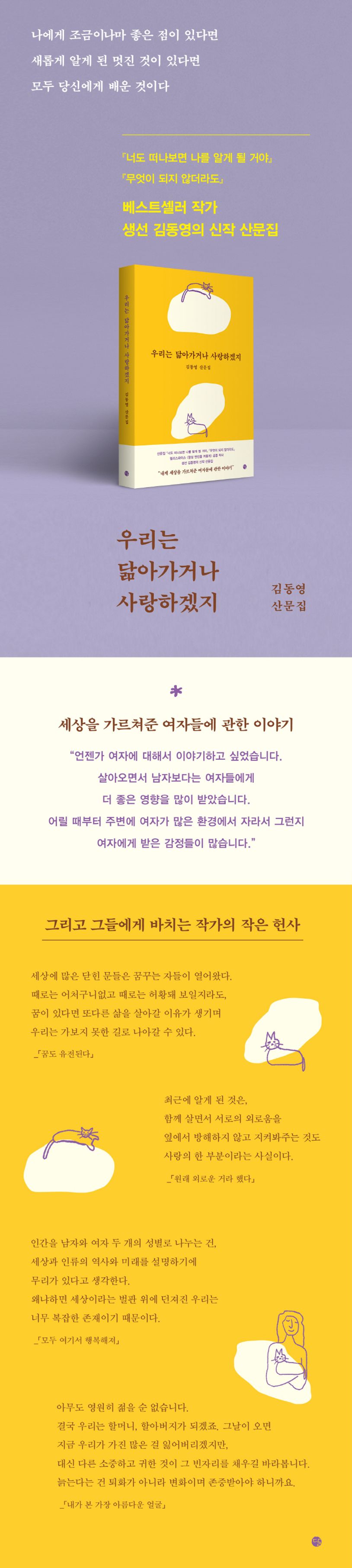 여행산문집 『너도 떠나보면 나를 알게 될 거야』와 산문집 『무엇이 되지 않더라도』 등을 통해 고유한 감성을 감각적인 문장으로 표현해온 김동영 작가가 신작 산문집을 펴낸다. 이번 산문집 『우리는 닮아가거나 사랑하겠지』에는 작가가 살면서 만난 여성들에 관한 이야기와 그로 인해 자신이 느끼고 배운 것들이 담겨 있다. “살아오면서 남자보다는 여자들에게 더 좋은 영향을 받”아왔다는 작가는 그 영향 속에 실제로 자신이 느껴보지 못한 감정들이나 특별한 지식 그리고 사유와 행동들의 포함되어 있었다는 것을 점차 알게 된다. 성장하는 과정에서 그들에게 배운 요소들이 현재의 자신을 이루고 있다는 것도. 그러니까 이 책은, 자신을 성장시켜준 여성들에게 바치는 따뜻한 헌사인 셈이다.