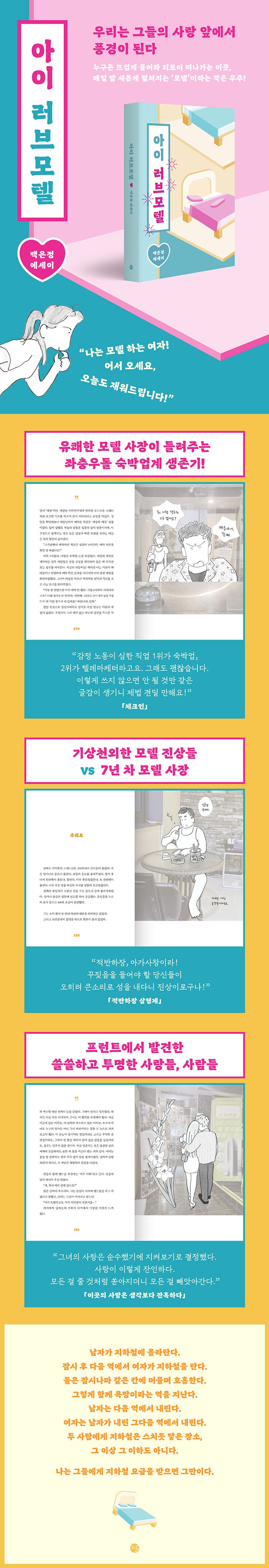 어느 모텔의 프런트, 고객이 입실한 지 10분 만에 울려퍼지는 ‘문이 열렸습니다’ 알람에 마음 졸이는 사람이 있다. 7년 차 모텔 운영자인 『아이 러브 모텔』의 저자다. “방에서 담배 냄새가 너무 많이 난다(흡연 객실이지만)”, “너무 춥다(한겨울에 창문을 열어서)” 등 갖가지 이유로 객실 교환 및 환불을 요구할지도 모른다. 긴장한 채로 곧 들이닥칠 고객을 기다리지만… 마주하는 것은 나른한 미소를 얼굴 가득 꽃피운 연인들이다. 저자는 얼레벌레 안도하며 자리로 돌아간다. 머무는 시간이 10분이든 1시간이든 그것이 사랑이라면 무슨 상관이랴, 그들의 미소에 덩달아 흐뭇해진 표정으로 생각할 뿐.
