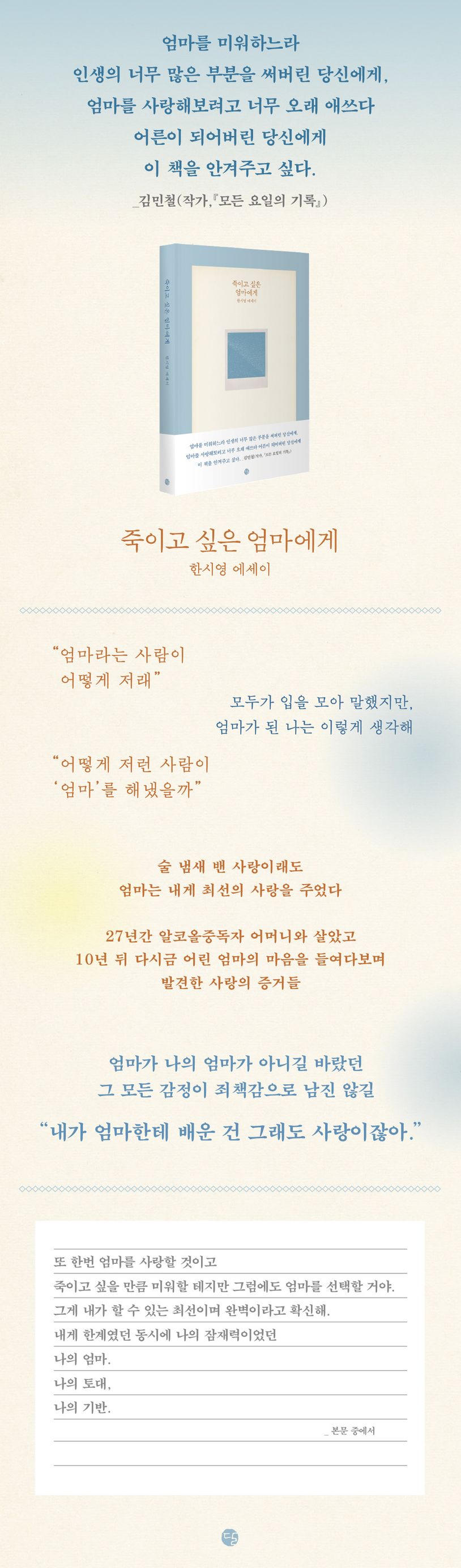 『죽이고 싶은 엄마에게』는 27년간 ‘알코올중독자의 딸’로 살아온 저자가 지나간 시간을 열심히 곱씹은 기록이다. 나와 가장 오랫동안 살을 맞대었던 엄마가 나를 가장 외롭게 만든다는 것이 서러워 어린 저자는 다이어리에 빨간 크레파스로 ‘이영숙 죽어라’라고 적었지만, 사실 그 누구보다도 엄마를 성실히 사랑했다. 그렇다면 엄마는, 엄마는 어땠을까?