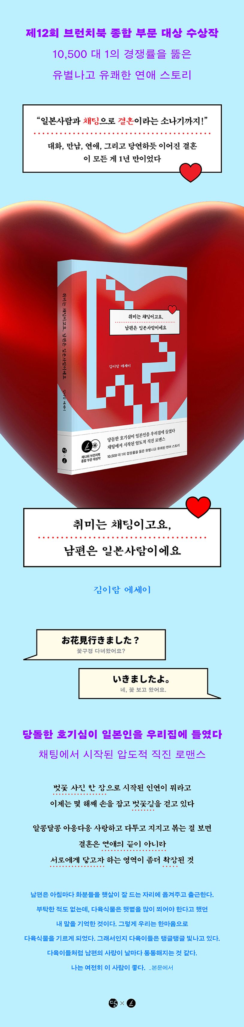 유별나고도 유쾌한 일본생활기를 그리는 저자 김이람이 첫 책 『취미는 채팅이고요, 남편은 일본사람이에요』를 출간했다. 이 책은 제12회 카카오 브런치북 출판 프로젝트에 응모한 10,500여 편의 작품 가운데 대상으로 선정된 〈우리 집 일본인〉을 바탕으로 한 에세이로, 저자가 일본생활 10년 차 때 ‘랜덤채팅’에서 만난 일본인 남자와 결혼해 함께 사는 이야기를 담고 있다. ‘채팅’은 그 인연의 출발점이자 지금도 누군가와 일상을 나누는 그의 방식이다.
