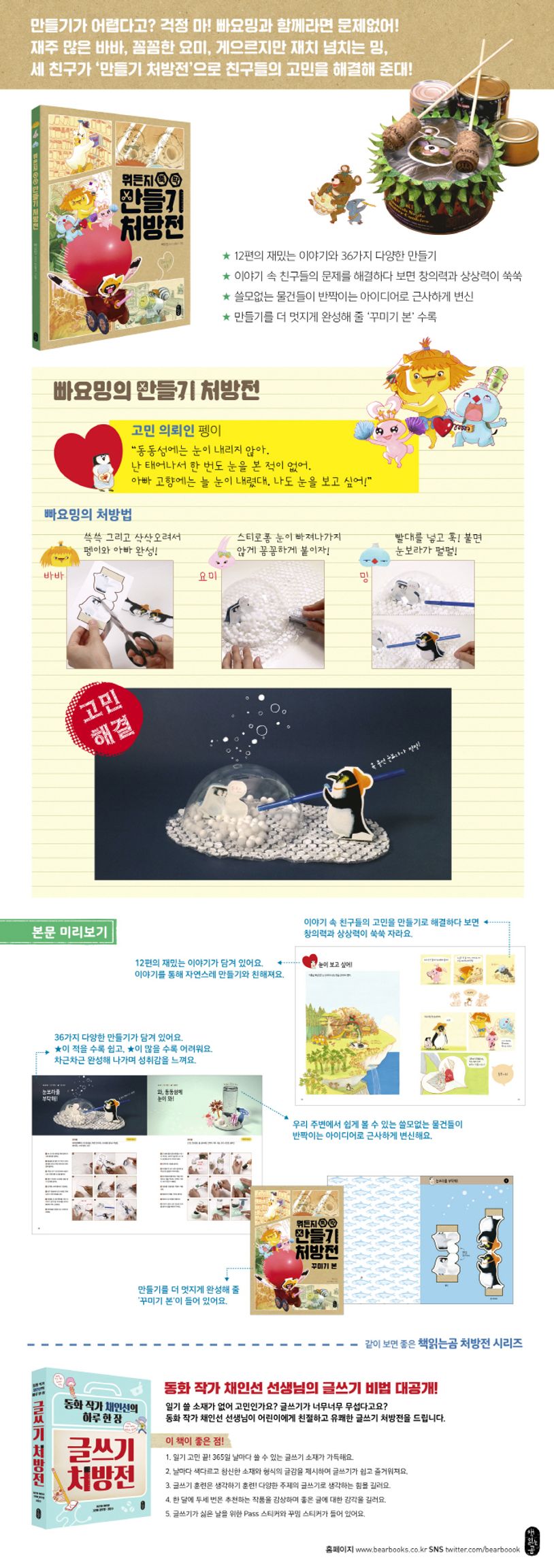 『뭐든지 뚝딱 만들기 처방전』은 만들기로 친구들의 고민을 해결해 주는 빠요밍의 이야기가 담긴 스토리텔링 만들기 책입니다. 이야기를 읽고 그림을 보는 것만으로도 즐거운 빠요밍의 12가지 에피소드가 펼쳐지는데 각 에피소드에는 그에 딸린 기본 만들기 1가지, 응용 만들기 2가지가 등장합니다. 반짝이는 아이디어가 돋보이는 36가지의 다양한 만들기를 직접 따라해 보세요. 만들기 본연의 즐거움과 기쁨을 경험할 수 있을 것입니다.