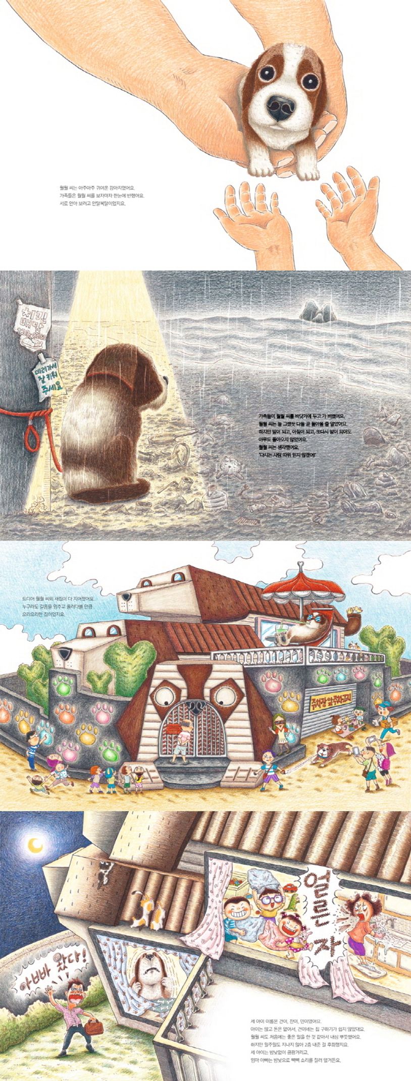 『으리으리한 개집』은 가족의 의미와 행복의 조건을 되짚어 보게하는 그림책입니다. 애완동물을 버리는 사람들의 모습을 까칠한 월월 씨의 모습으로 꼬집습니다. 또한 버려짐에도 불구하고 다시 또 인간을 좋아하게 된 월월씨의 모습은 인간에 대한 애정이 고스란히 느껴집니다. 더불어 피가 이어지지 않아도, 종이 같지 않아도 가족이 될 수 있다는 사실을 보여줘 아이들에게 가족의 의미를 다시금 생각해보도록 합니다.