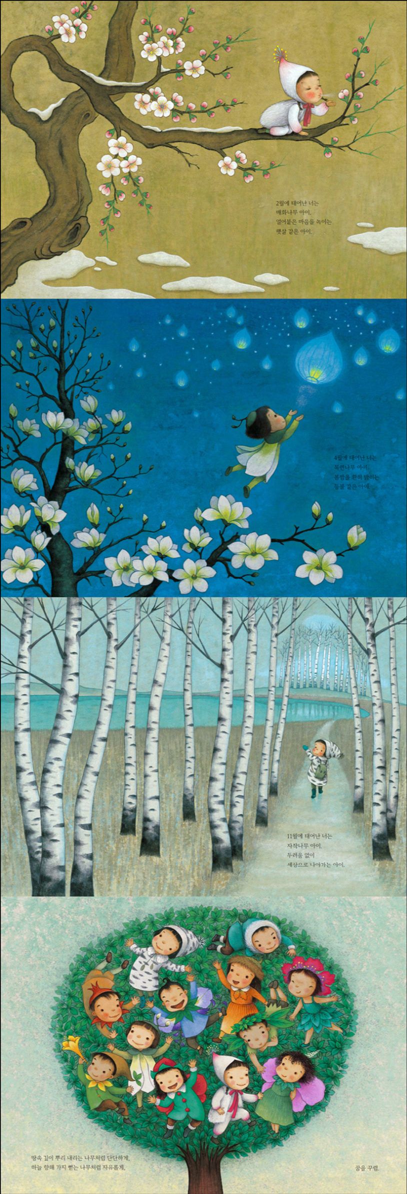 책 속에 담긴 일 년 열두 달, 달마다 가장 아름다운 모습을 지닌 나무가 내가 태어난 달의 나무가 됩니다. 열두 달의 아이들은 나무의 품성을 그대로 닮아 있습니다. 1월의 아이는 겨울에 첫 꽃을 피우는 동백나무처럼 힘차게 날아올라 새해를 가장 먼저 맞이하는 호기심 넘치는 아이, 6월의 아이는 마을 어귀에 서서 커다란 그늘을 드리우는 느티나무처럼 품 넓은 아이, 10월의 아이는 주렁주렁 도토리를 열어 산 속 식구들을 두루 먹이는 참나무처럼 속 깊은 아이입니다.