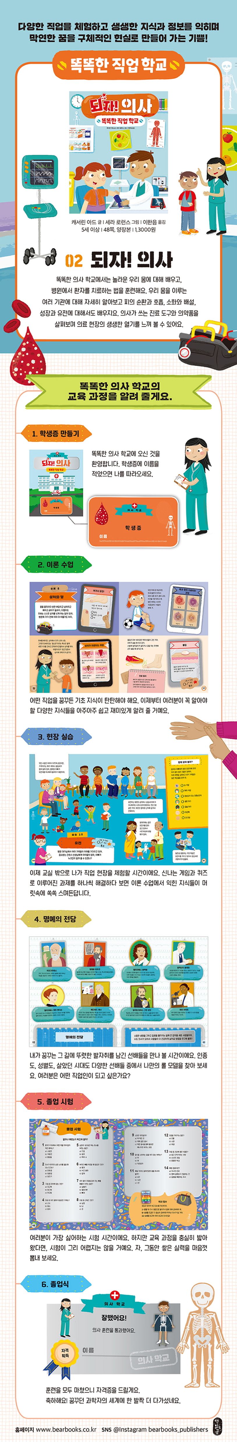 우리 몸에 대한 전문 지식을 갖고 아픈 사람을 치료하는 의사가 되기 위한 최고의 안내서. 우리 몸의 여러 기관, 피의 순환, 소화, 근육과 뼈대, 피부, 알레르기, 성장과 유전에 관한 정보까지 한 권에 모두 담겨 있어요.