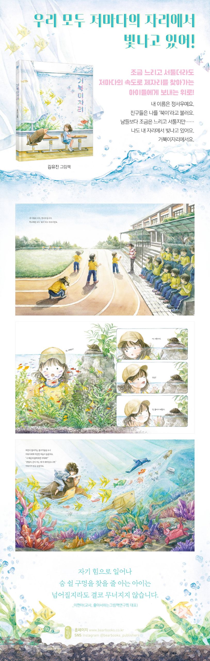 서우는 무엇을 하든 또래들보다 조금 느린 편이다. 친구들은 그런 서우를 ‘북이’라고 부른다. 달리기 시합이 있는 날, 발이 느린 서우 때문에 서우네 반은 꼴찌를 하고 만다. 집으로 돌아가는 길, 서우는 친구들 눈치를 살피느라 모자를 푹 눌러쓰고 뒤처져 걷다가 새로 생긴 수족관 앞에서 저도 모르게 걸음을 멈춘다. 수조 속을 이리저리 헤엄쳐 다니는 알록달록한 물고기에 마음을 빼앗긴 탓이다. 그런데 수조 한 귀퉁이에 외따로 떨어져 볕을 쬐는 거북이가 눈에 들어온다. 서우는 집에 돌아온 뒤에도 거북이 생각이 머리에서 떠나지 않는다. 그리고 거북이에게 친구를 만들어 주기로 한다. 제일 자신 있는 종이접기로 말이다. 색종이를 접어 거북이를 만들고 책상 서랍을 비워 바다를 꾸민 뒤 거북이를 풀어 주려고 할 때다. 이럴 수가, 거북이 조금씩 꿈틀거리더니 살아 움직이는 게 아닌가!