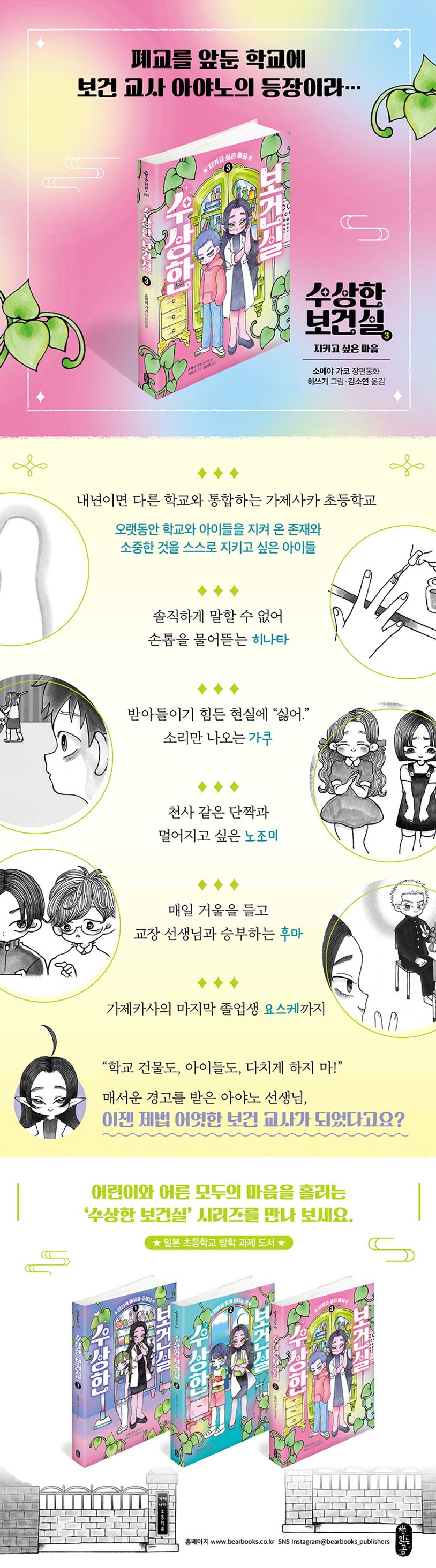 마음을 노리는 ‘수상한 보건실’ 시리즈 3권. 수상한 보건 교사 아야노, 이번에는 폐교를 앞둔 학교를 찾아간다. 그곳에서는 무슨 일이 벌어질까. 내년이면 다른 학교와 통합하는 가제사카 초등학교에는 오랫동안 학교와 아이들을 지켜 온 존재와 소중한 것을 스스로 지키고 싶은 아이들이 있다. 속마음을 감춘 채 손톱을 물어뜯는 히나타, 동아리가 사라질 상황에 싫은 마음만 가득한 가쿠, 천사 같은 단짝 코코아와 멀어지고 싶어진 노조미, 아침마다 교장 선생님과 말로 승부하는 후마, 마지막 졸업생으로서 학교에 추억을 남기고 싶은 요스케와 친구들까지, 아야노는 이 아이들에게 어떤 특제 아이템을 꺼내 보일까. 설령 사라진다고 해도 끝내 ‘지키고 싶은 마음’에 관한 이야기.