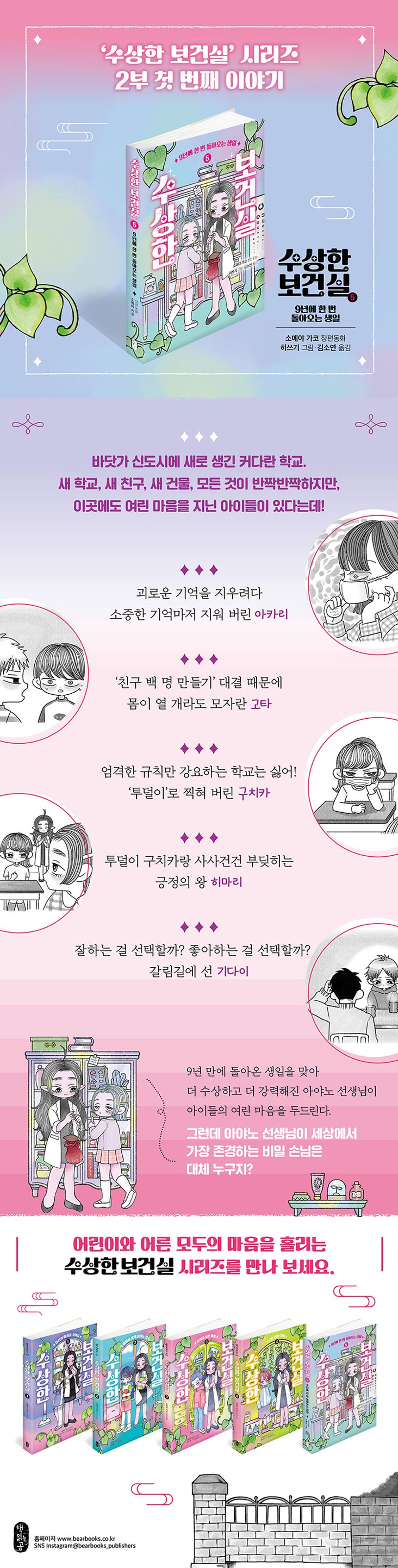 아이들의 말 못 할 고민을 기발한 상상력으로 해결해 주는 〈수상한 보건실〉 시리즈 다섯 번째 책이 출간되었다. 이번 이야기는 바닷가 신도시에 새로 생긴 크고 말끔한 학교에서 펼쳐진다. 새 동네, 새 학교, 새 친구, 모든 것이 반짝반짝하지만, 이곳에도 남몰래 여린 마음을 애태우는 아이들이 있다!