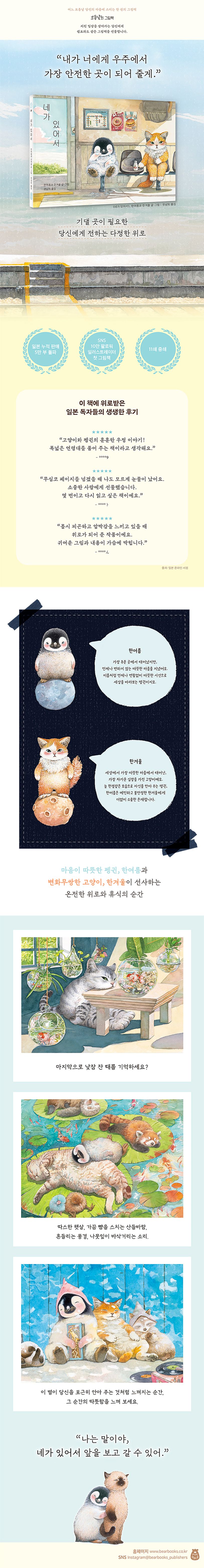 일본에서 6만 부가 넘게 팔린 바로 그 책! SNS 10만 팔로워 작가 ‘한여름과 한겨울’의 첫 그림책이 한국에서 출간되었다. 가장 추운 세계에서 태어났지만, 언제나 변치 않는 따뜻한 마음을 지닌 펭귄 ‘한여름’과 세상에서 가장 따뜻한 마음에서 태어난 변화무쌍한 고양이 ‘한겨울’. 서로에게 가장 소중한 존재인 두 친구는 늘 한결같은 모습으로 서로의 옆을 지킨다. 이 책은 한여름과 한겨울이 서로에게 보내는 다정한 편지 형식의 글과 둘의 일상을 담은 사랑스러운 그림으로 일상에 지친 이들의 마음을 따스하게 어루만진다. “네 울음소리가 밖으로 새어 나가지 않도록 너에게 우주에서 가장 안전한 곳”이 되어 주고 싶다는 작가의 마음이 누군가에게는 따뜻한 위로로, 또 다른 누군가에게는 든든한 응원으로 가 닿을 것이다.